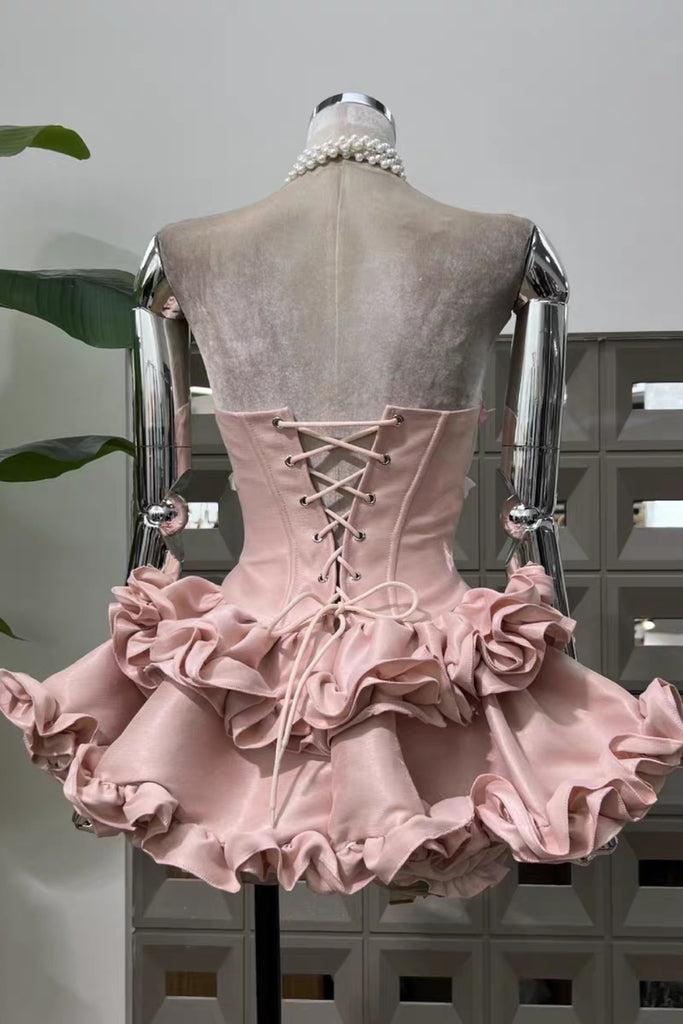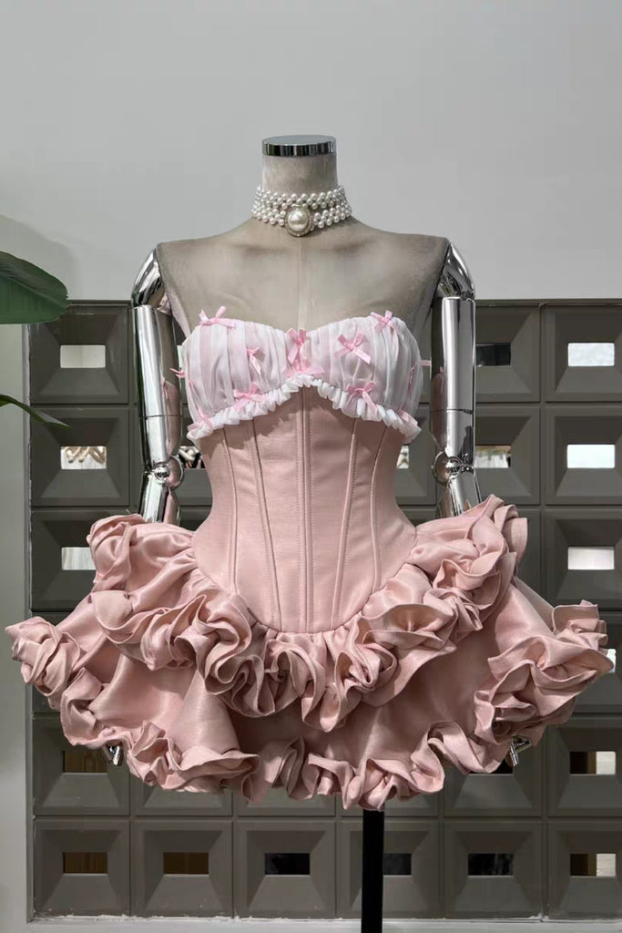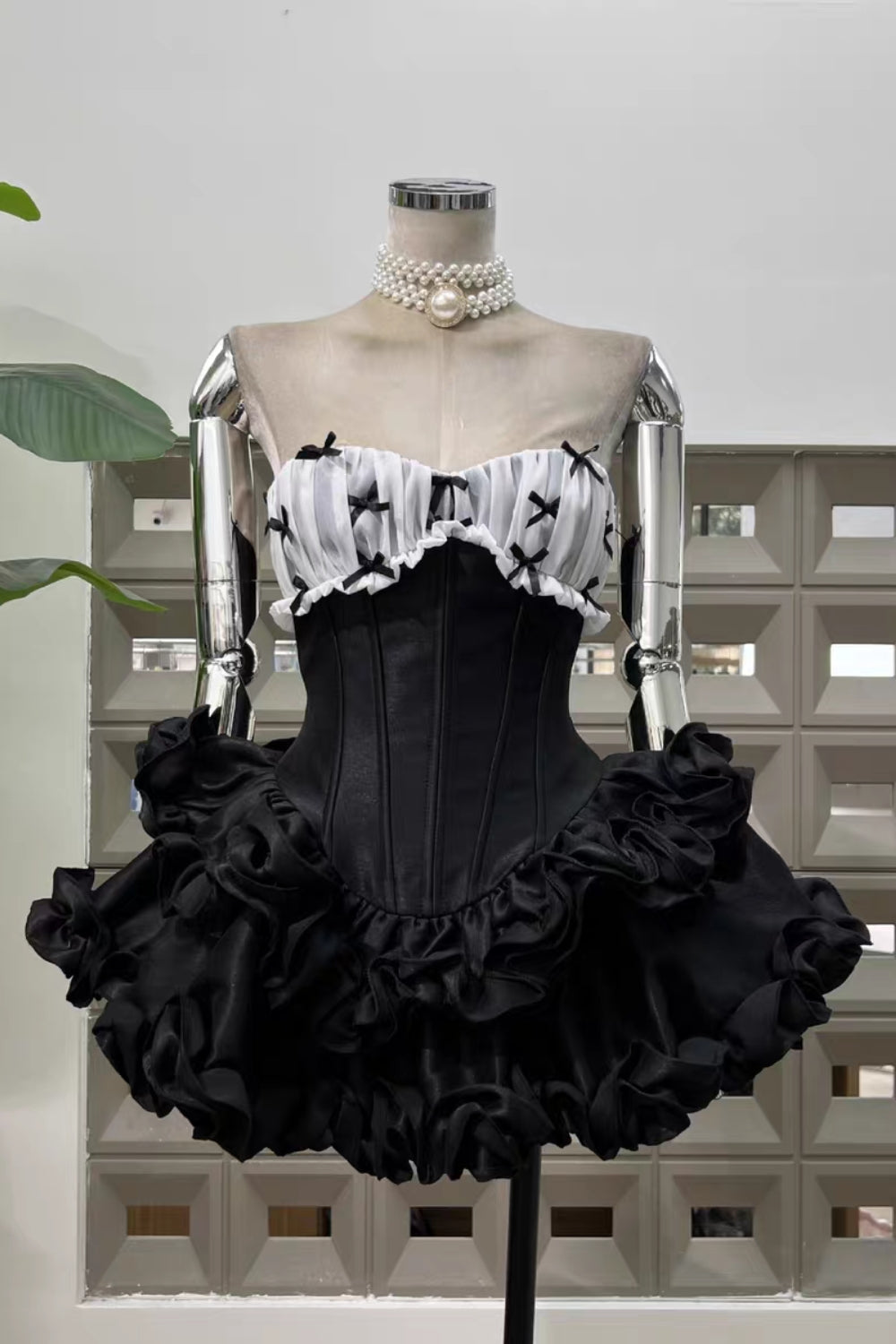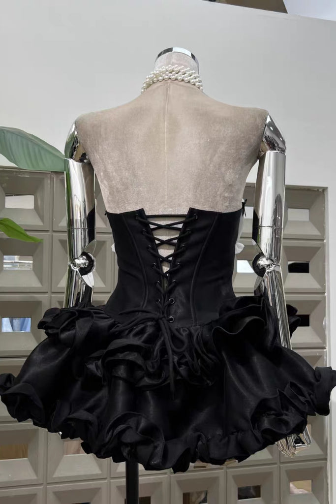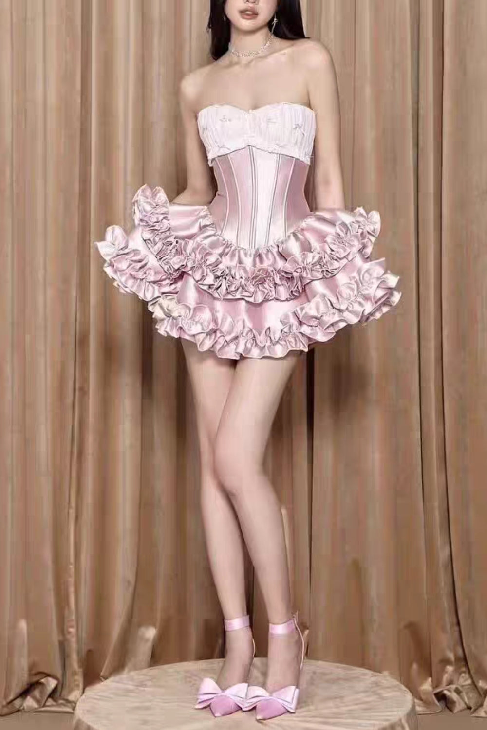 This Strapless Ruffle Corset Mini Dress combines elegance with a flattering fit. Its structured corset design shapes your silhouette, while the playful ruffle detail adds a feminine touch. Perfect for special occasions or nights out, this dress offers both style and confidence without straps to allow for versatile accessorizing. Feel supported and stunning every time you wear it.