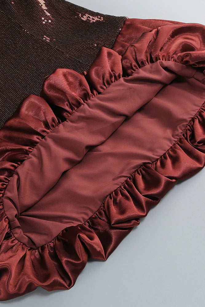 Elevate your evening wardrobe with this strapless sequin bubble mini dress in brown. Designed for a flattering fit, its strapless neckline highlights your shoulders while the bubble hem adds a playful dimension. The shimmering sequins provide captivating sparkle, making it a perfect choice for special occasions and nightlife. This dress combines bold style with a sophisticated silhouette, ensuring you stand out with confidence and elegance.