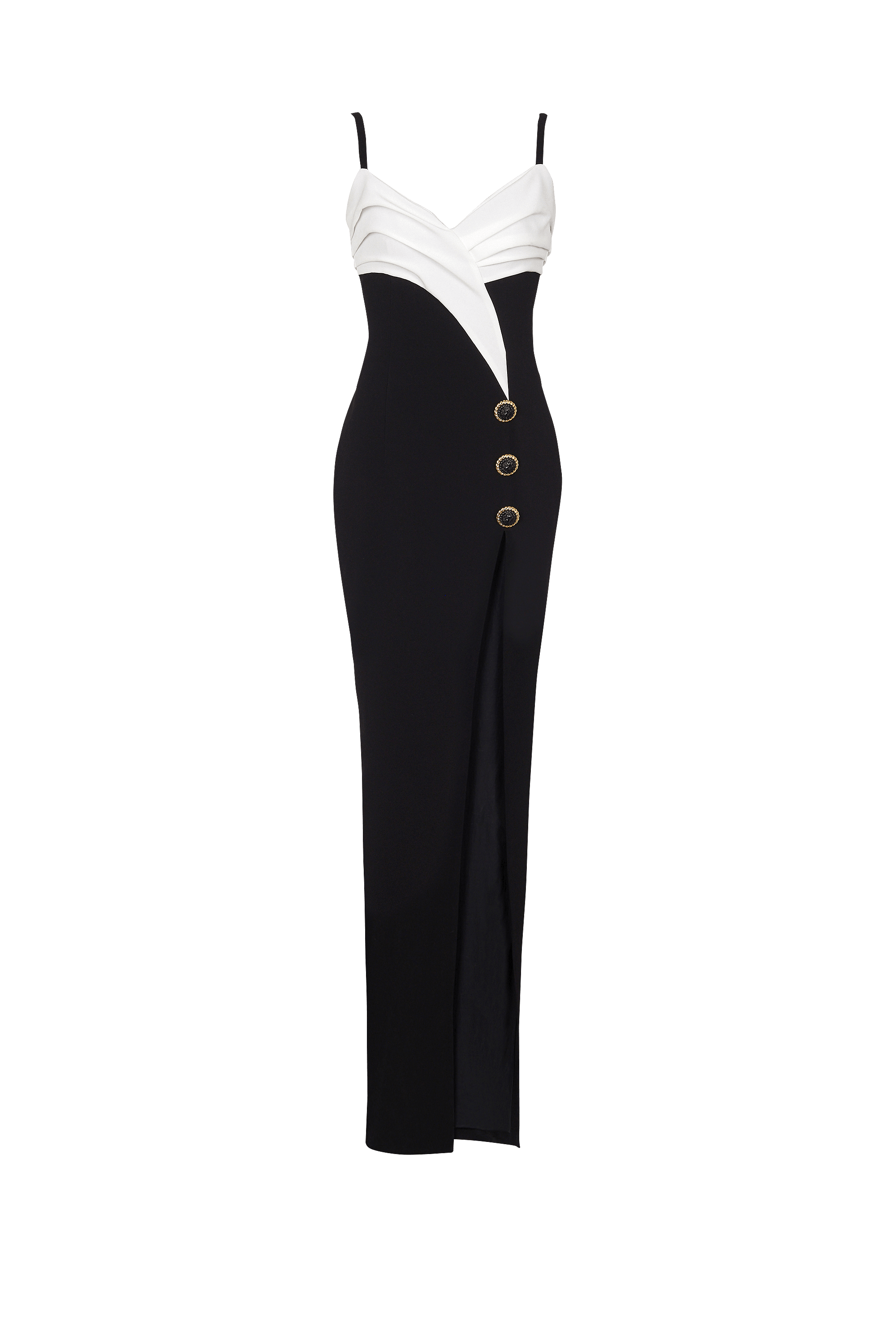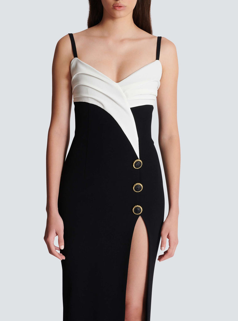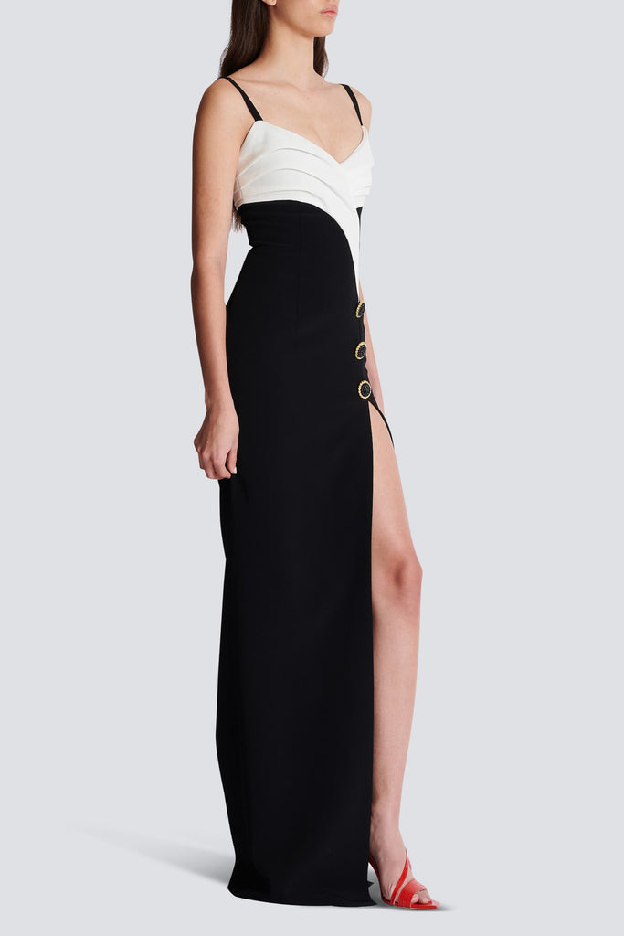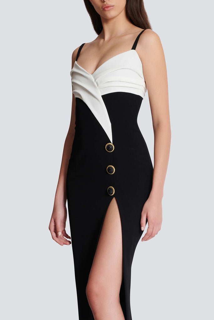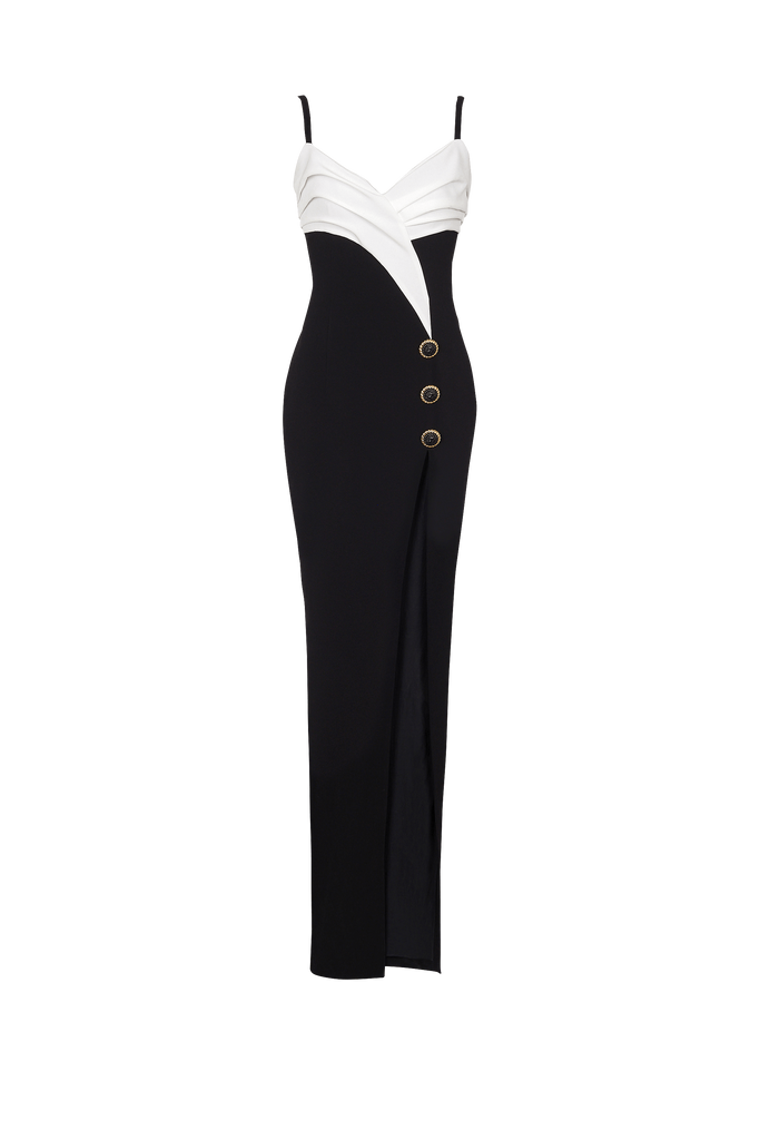 Crafted from high-quality crepe fabric, this two-tone maxi dress boasts a sleek design with a leg slit for added allure. Perfect for any occasion, this dress exudes elegance and style while providing maximum comfort. Elevate your wardrobe with this must-have statement piece.