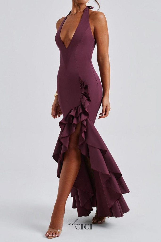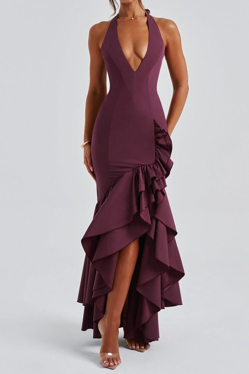 A stunning blend of elegance and charm, the Veronique maxi adds a captivating edge to your formal wardrobe this season. With its halter, plunge neckline and boning to the bodice to give a contoured, snatched shape to the figure, this design is elevated with a ruffle detail to the skirt. The look is complete with a playful, feminine split to the skirt.