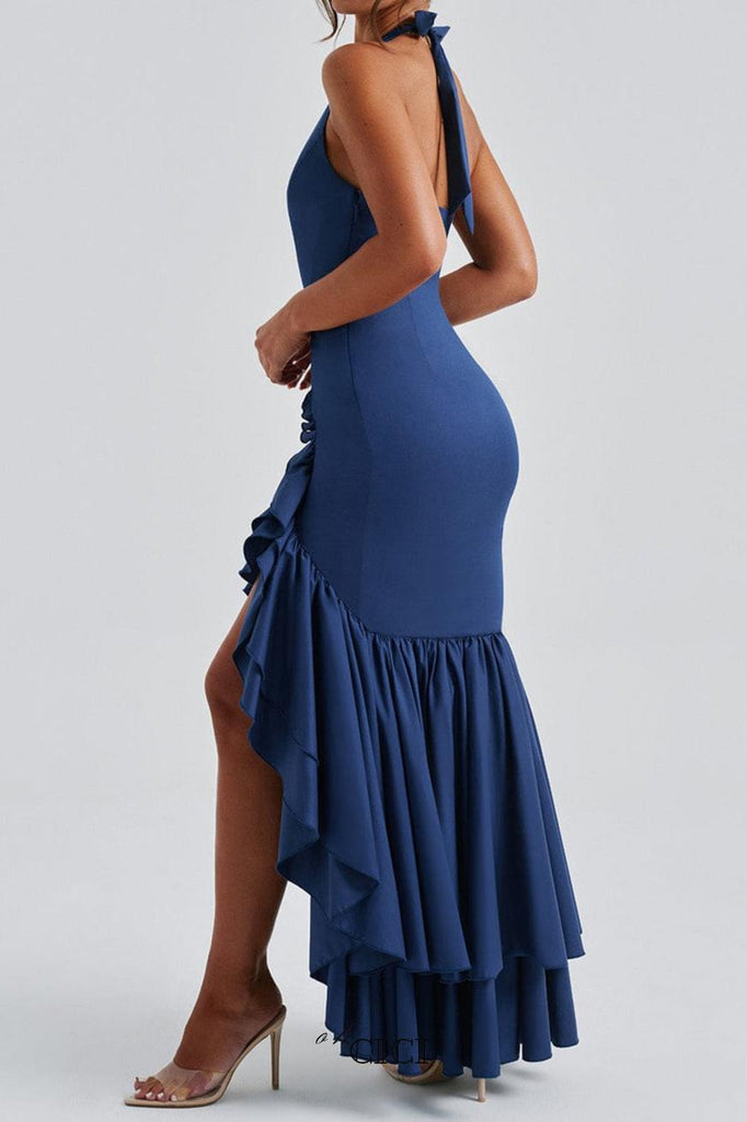 As an expert in fashion, I present to you the Veronique ruffle hem Maxi Dress in Navy. Made with a flattering ruffle hem, this dress offers a stylish silhouette and a touch of elegance. Perfect for any occasion, this dress is a must-have in your wardrobe.