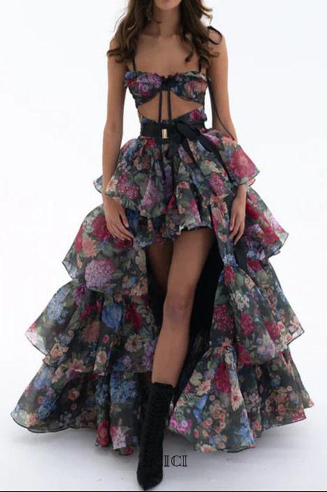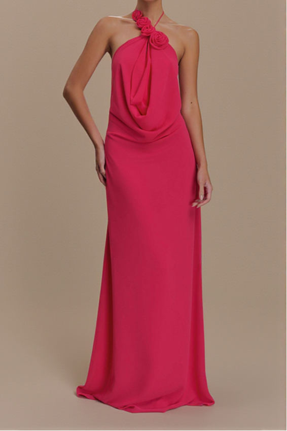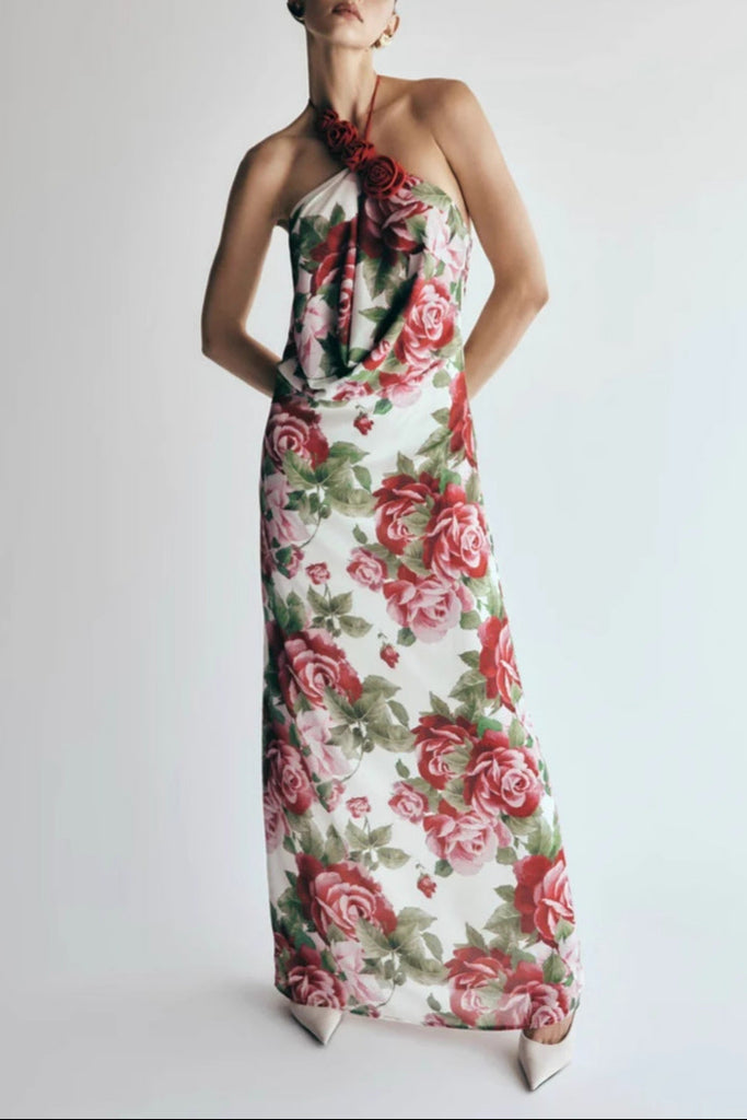 eunice Floral Halter Chiffon Ruffle Midi Dress in red