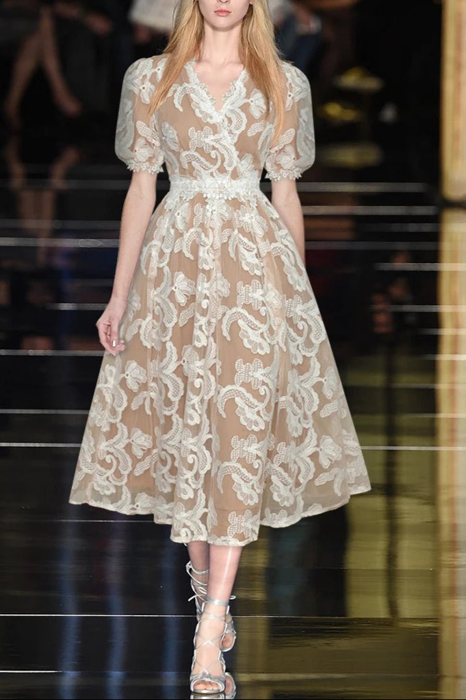 The Alisa Mesh Embroidered Puff Sleeves Midi Dress in Beige is a must-have for any fashion-forward individual. With its delicate embroidered details and flattering puff sleeves, this dress exudes elegance and sophistication. The midi length adds a touch of modernity, making it perfect for any occasion. Upgrade your wardrobe with this timeless piece.