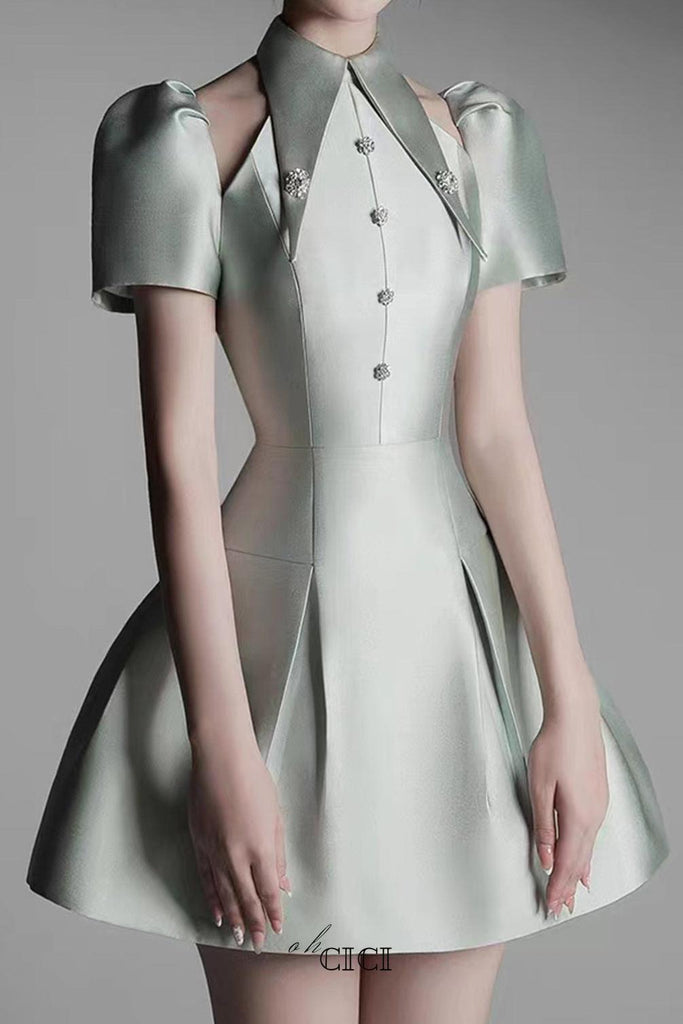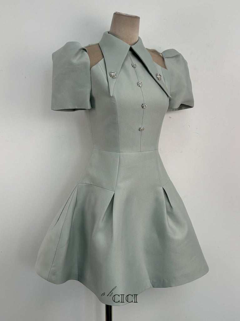 Expertly crafted, this puff sleeve cut out a-line mini dress in green combines style and comfort. The cut out details add a touch of sophistication, while the a-line silhouette flatters all body types. Elevate your wardrobe with this versatile dress, perfect for any occasion.
