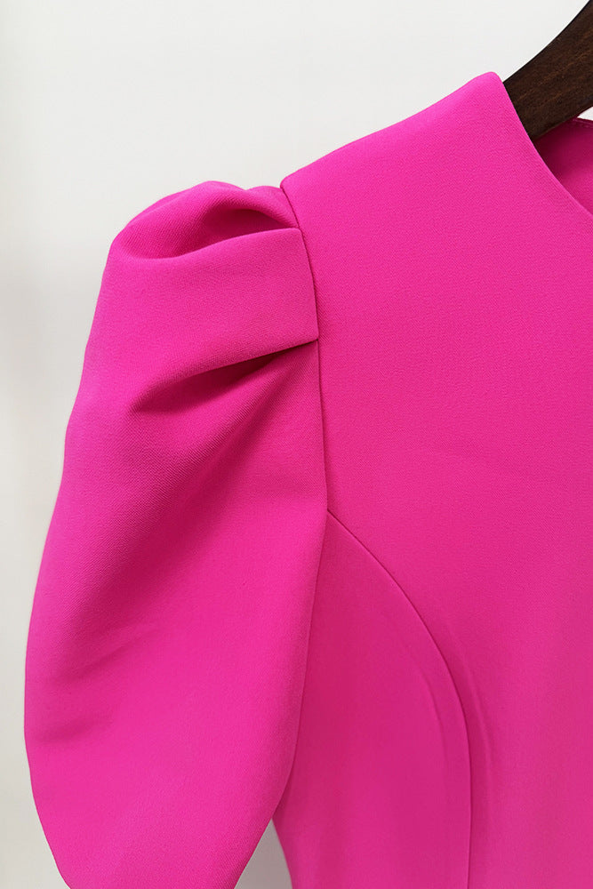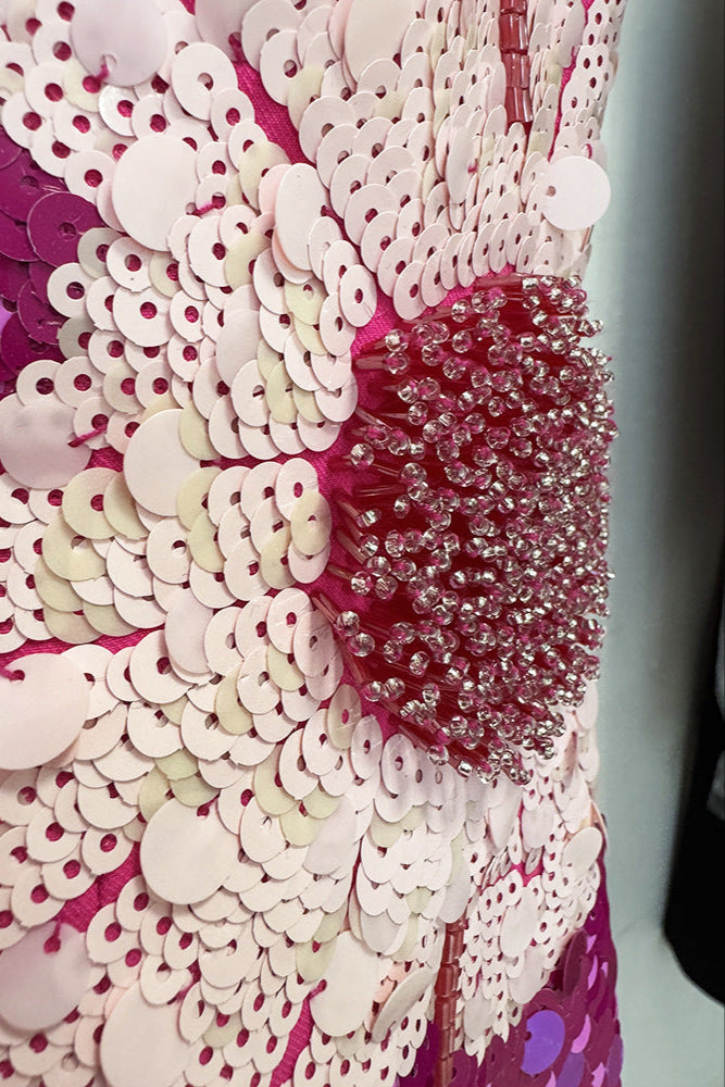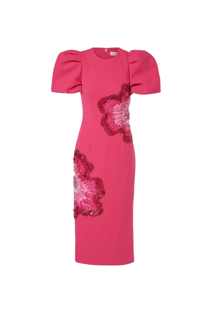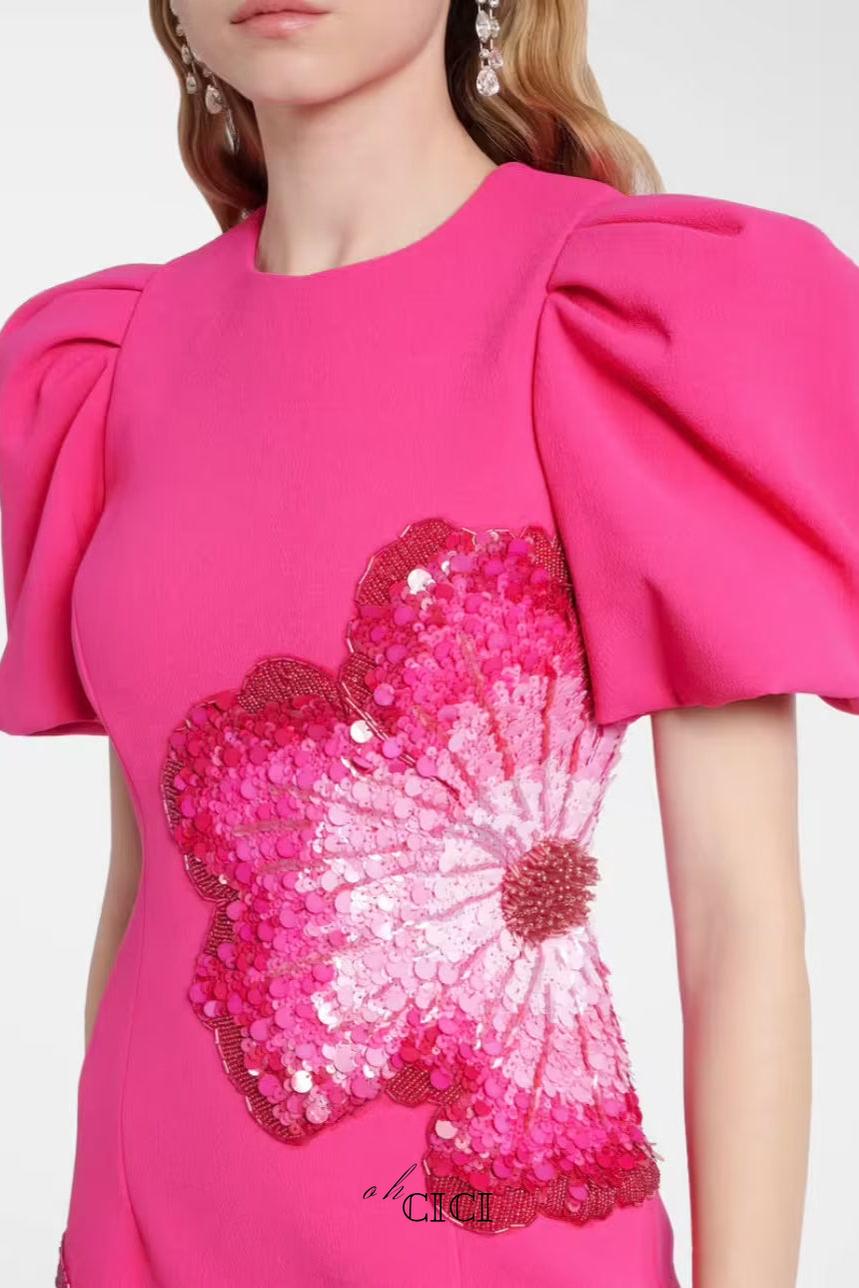 This pink midi dress features elegant puff sleeves and is adorned with delicate sequin flower embellishments, creating a refined, eye-catching look. Its flattering silhouette balances volume on the sleeves with a midi length, offering a sophisticated option for formal or special occasions. Crafted to combine subtle sparkle with a classic design, this dress delivers both style and comfort.