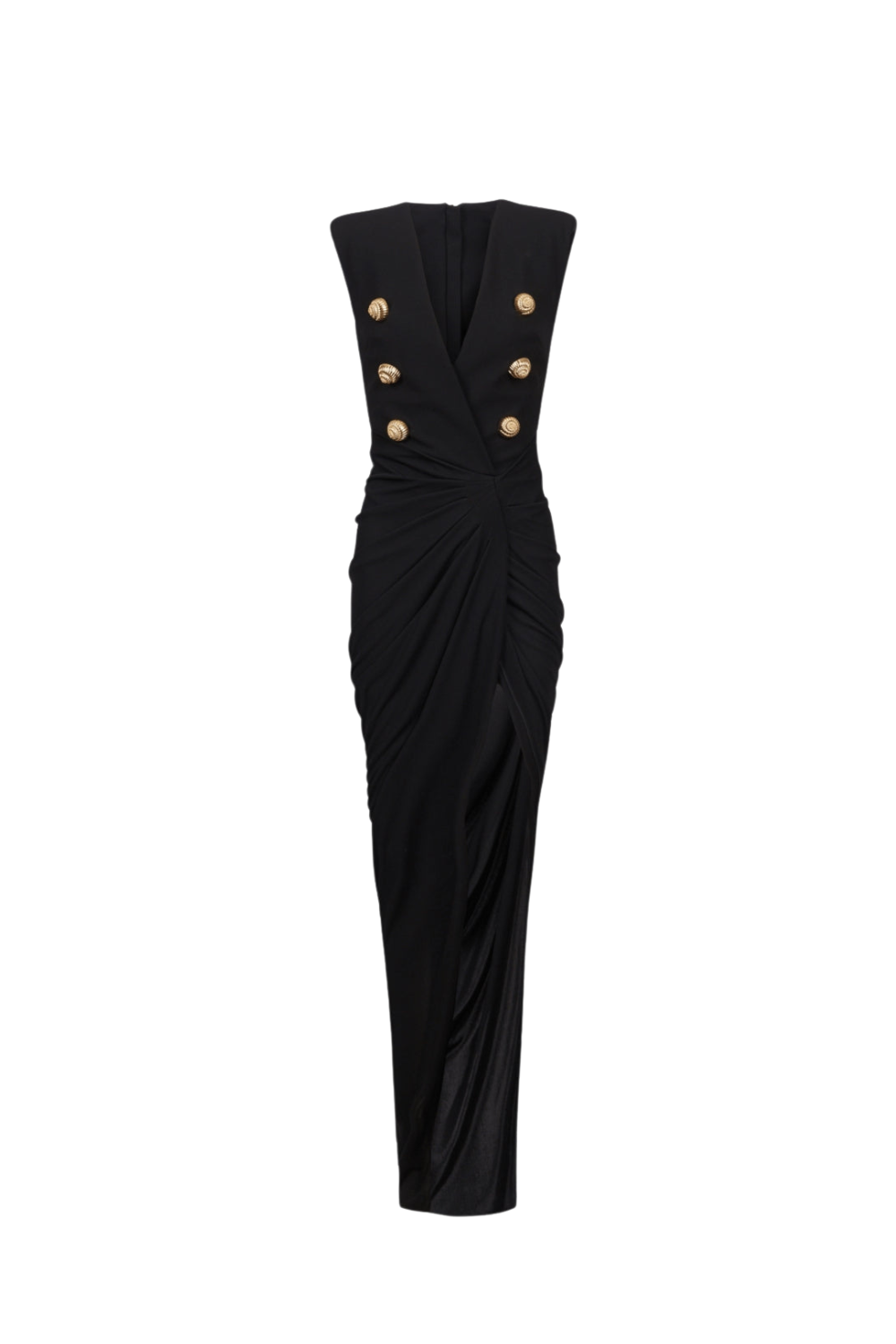 Deep-V Sleeveless Ruched Slit Maxi Dress in black