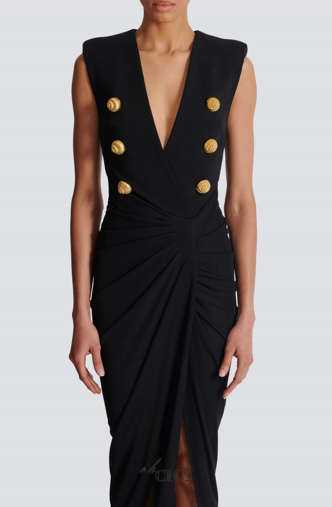 Deep-V Sleeveless Ruched Slit Maxi Dress in black – OH CICI