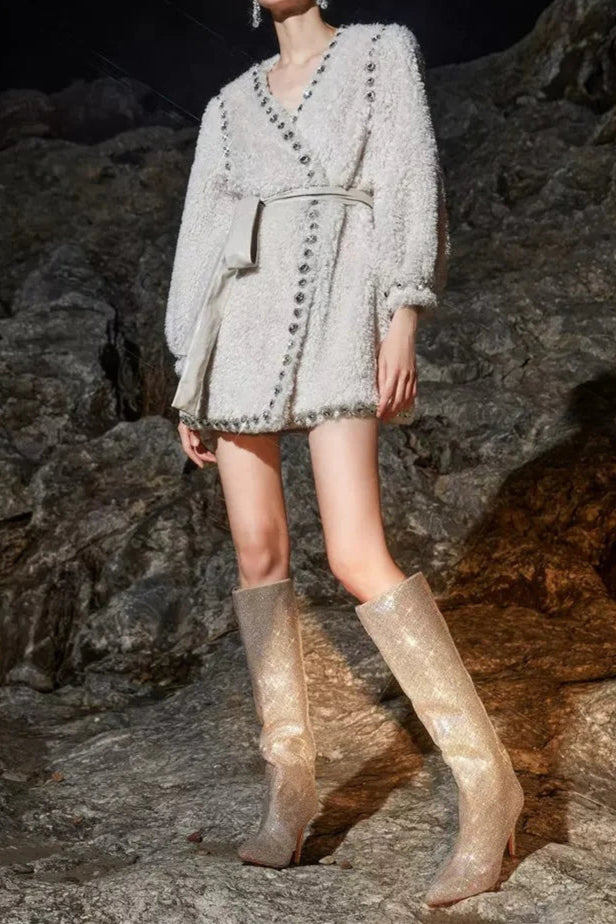 Beige V-Neck Long Sleeve Diamond Stud Coat