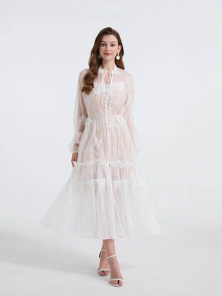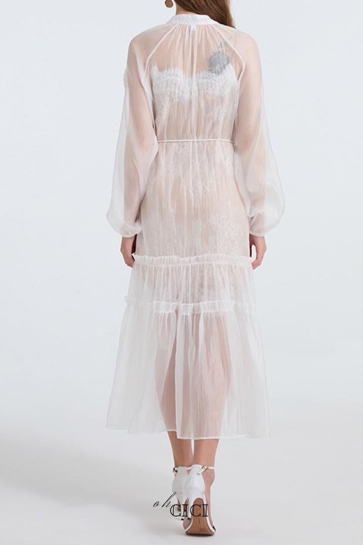 Elevate your wardrobe with this sophisticated see-through blouse maxi dress. The delicate white lace skirt creates a stunning contrast with the sheer top, offering an elegant silhouette that transitions effortlessly from day to evening occasions. Crafted with attention to detail, this dress combines contemporary transparency with classic lace craftsmanship for a refined, feminine aesthetic.