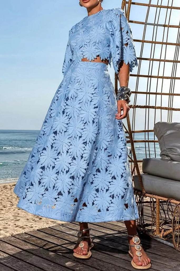 Lace Embroidered Top & Maxi Skirt Two-Piece Set in blue