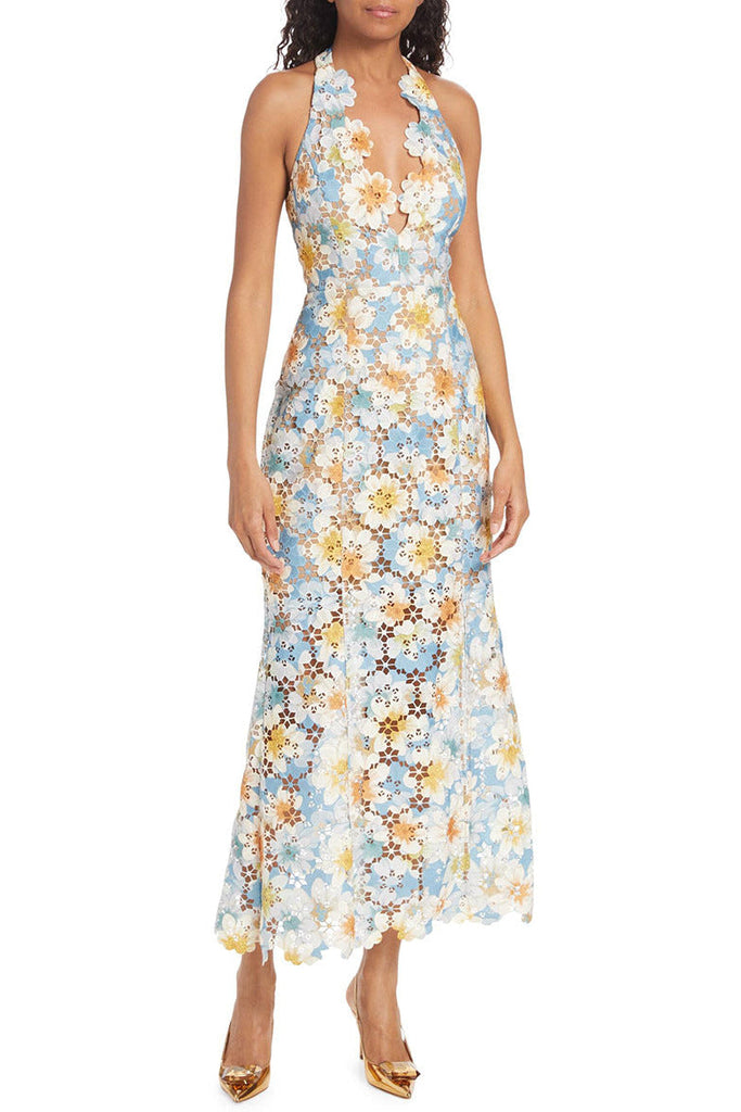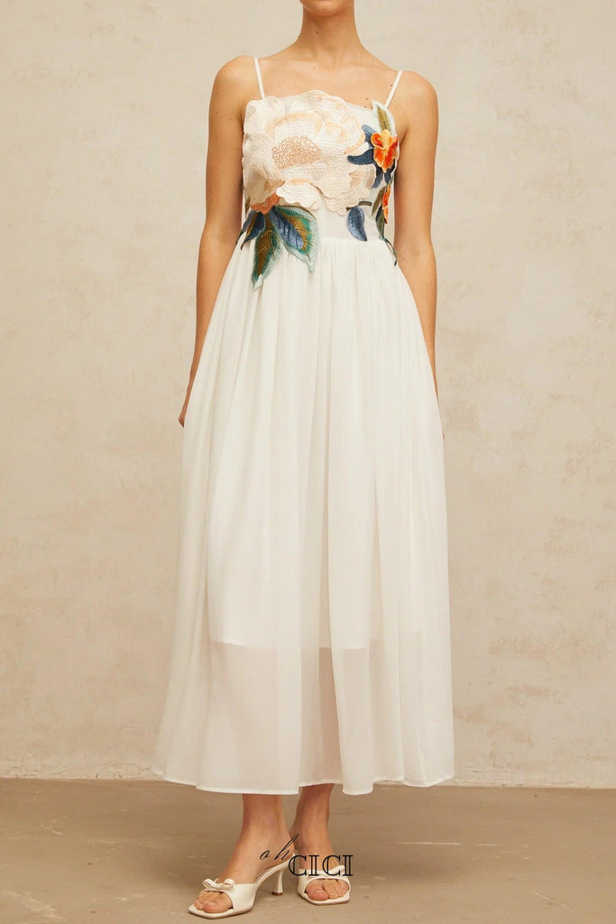 roberta white Asymmetric appliqué halter sleeveless midi dress
