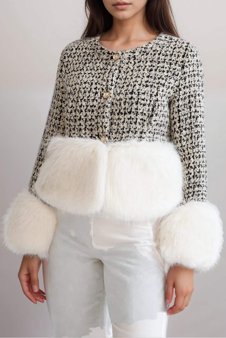 Elevate your winter wardrobe with this sophisticated tweed jacket, adorned with plush faux fur trims at the hem and cuffs. The classic pattern combines with luxurious details, making it a chic option for both casual and formal looks.