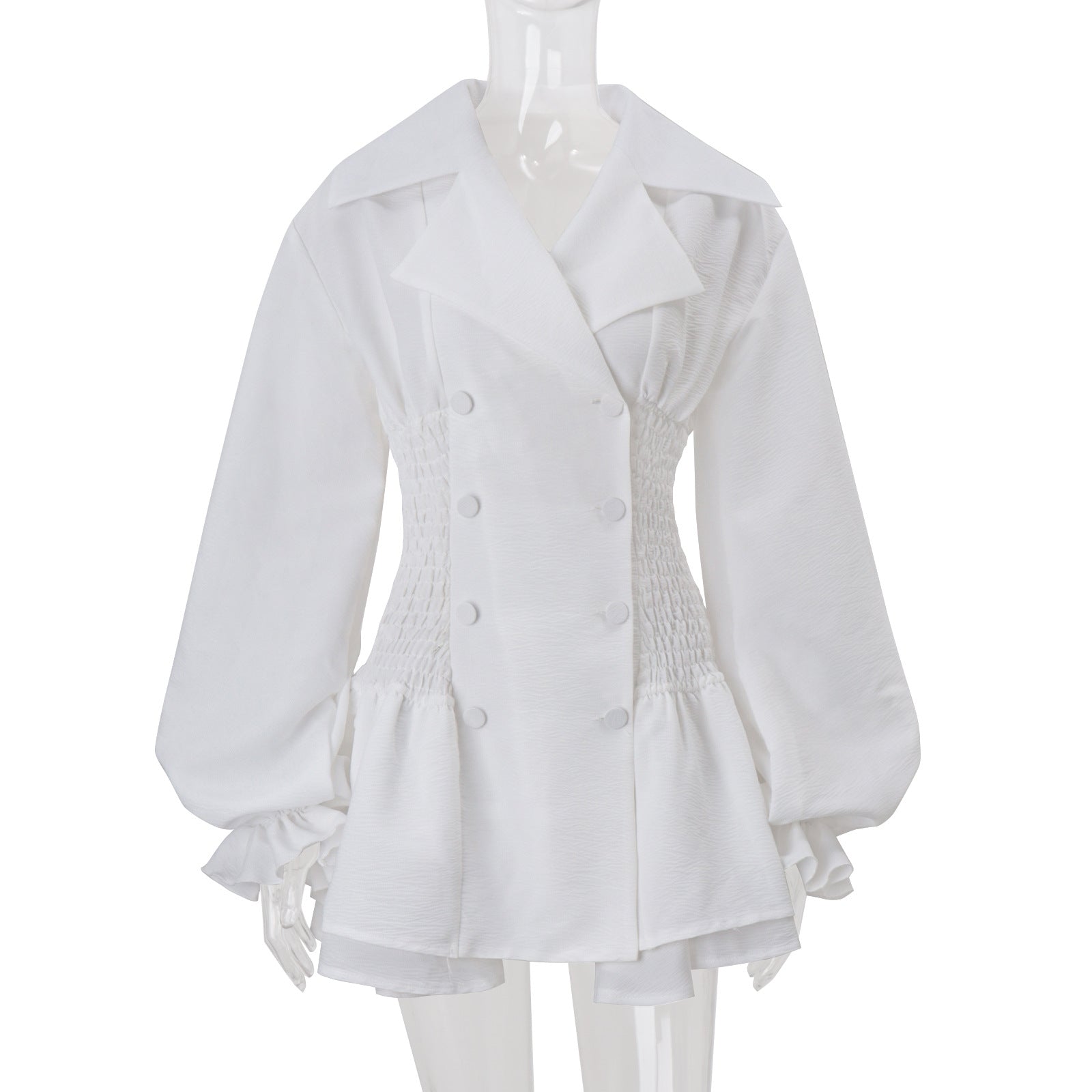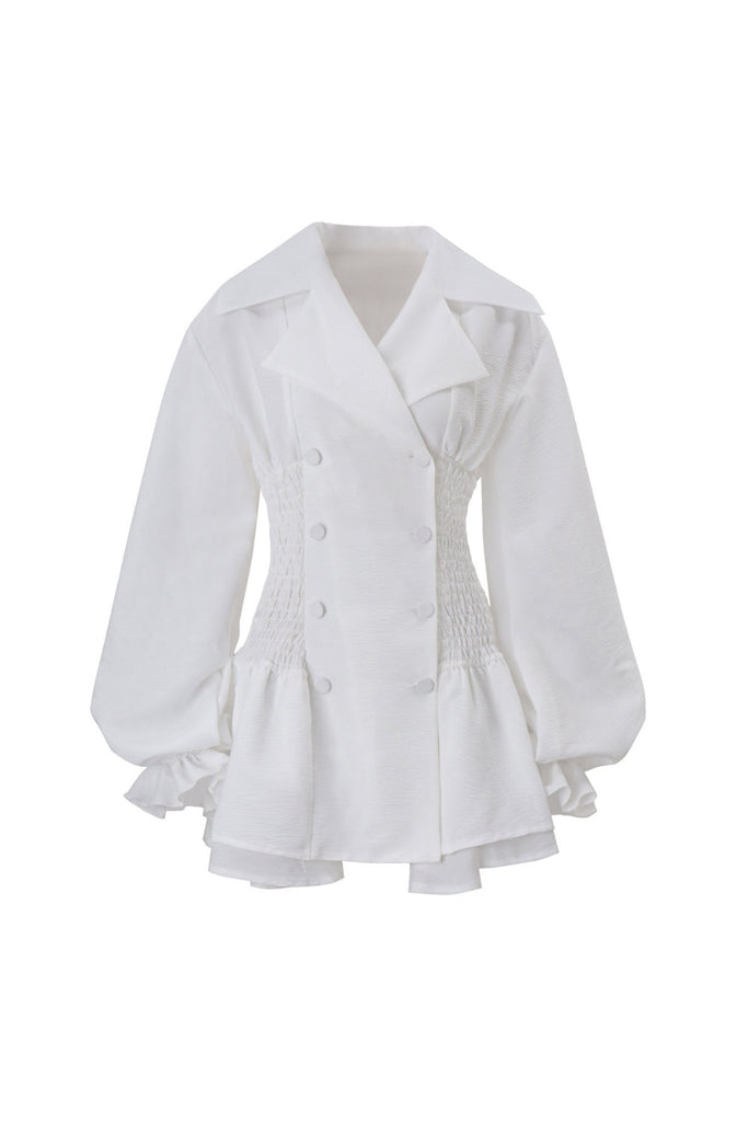 The Zenobia dress combines theatrical elegance with contemporary silhouette. Oversized lapels frame the neckline while functional buttons add structural interest, creating a polished foundation. Voluminous puff sleeves deliver dramatic movement and dimension, balancing the fitted bodice. The tutu-inspired skirt provides architectural volume and playful sophistication, while the mini length keeps the overall look modern and wearable. Crafted in crisp white, this piece transitions seamlessly from statement occasion wear to elevated everyday styling. Perfect for those seeking a dress that commands attention through thoughtful design rather than excess.