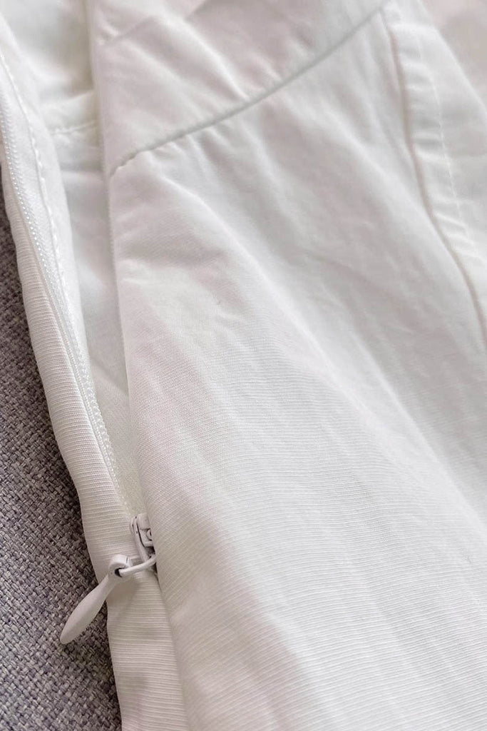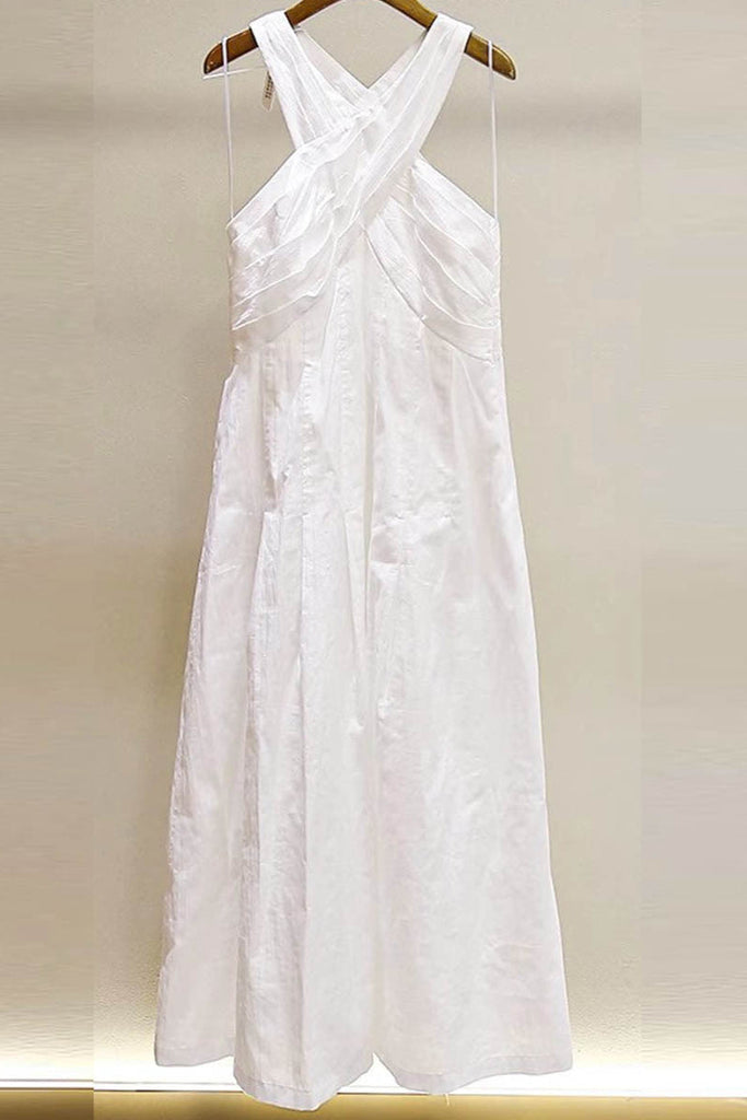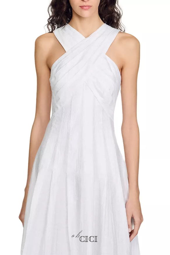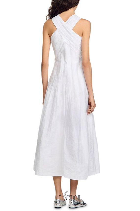 This elegant high crossover V-neck maxi dress features delicate pleating that adds texture and movement. The crisp white fabric creates a timeless and sophisticated look, perfect for both formal occasions and stylish daytime events. Its flattering V-neckline and flowing silhouette provide comfort and an elongating effect, making it a versatile addition to any wardrobe.