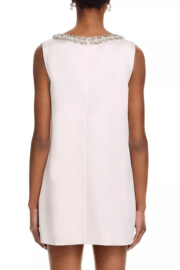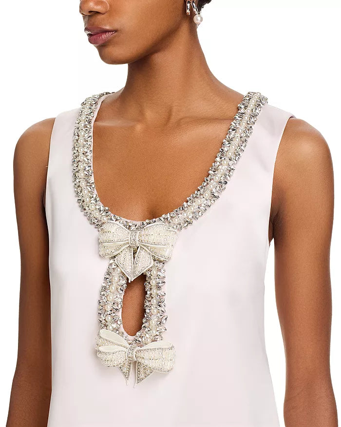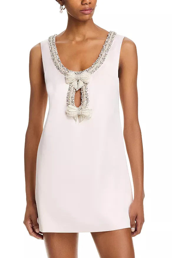This white mini dress features a delicate bow detail embellished with sparkling rhinestones, adding a refined touch of elegance. Its flattering silhouette and eye-catching accents make it an ideal choice for special occasions where sophistication and style are paramount. Crafted to highlight your confidence and grace, this dress combines classic charm with modern glamour.