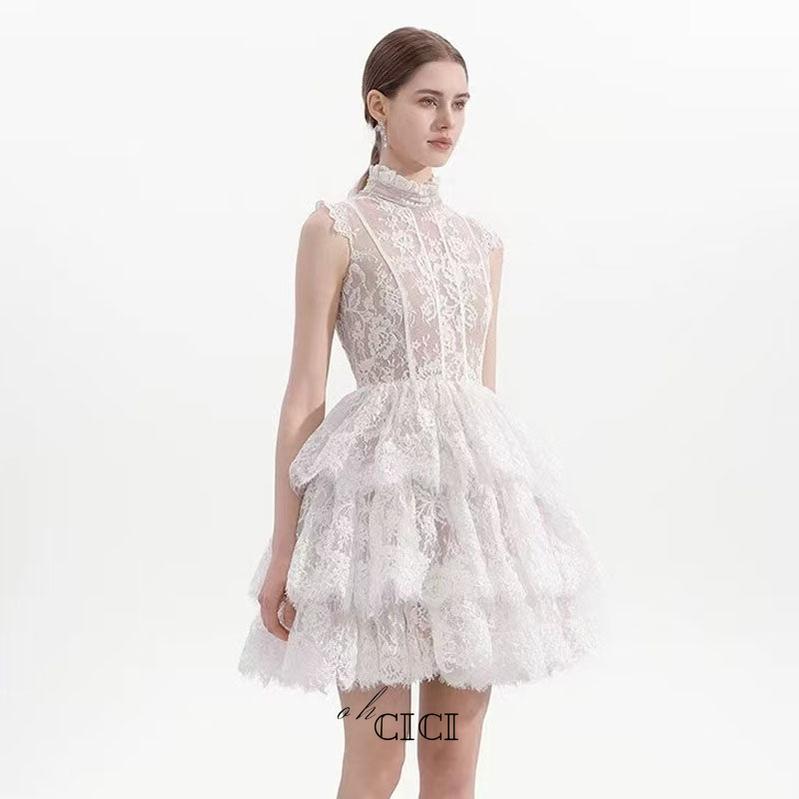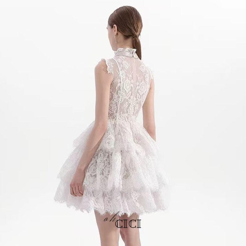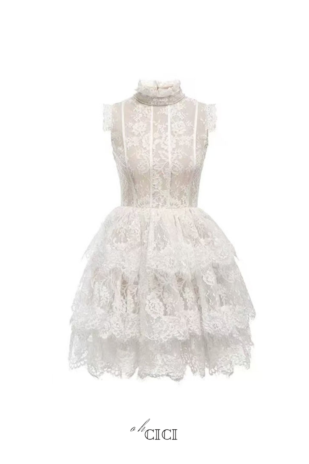This elegant sleeveless mini dress features a sophisticated stand collar and delicate lace detailing, complemented by a playful tutu-style skirt. The pristine white color offers versatile styling options for various occasions. The structured collar adds a refined touch to the feminine silhouette, creating a perfect balance between formal elegance and youthful charm.