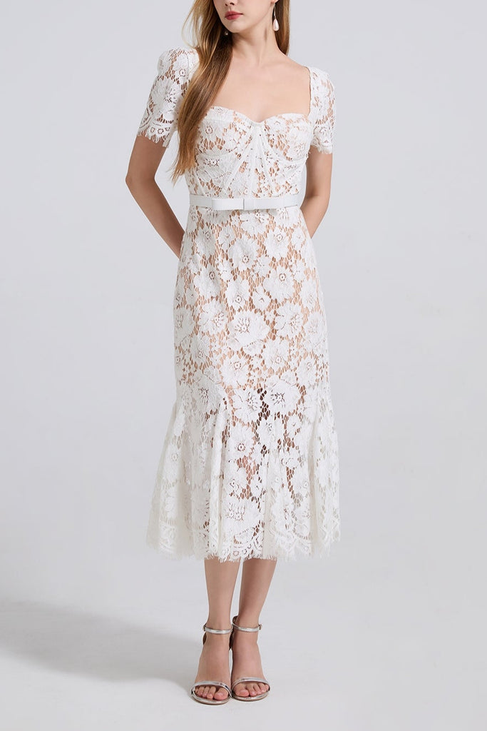 This elegant white midi dress features a flattering square neckline and delicate lace detailing, creating a timeless and feminine look. Short sleeves offer comfortable coverage, while the included belt cinches the waist to enhance your silhouette. Perfect for special occasions or stylish everyday wear, this dress combines classic charm with modern comfort.
