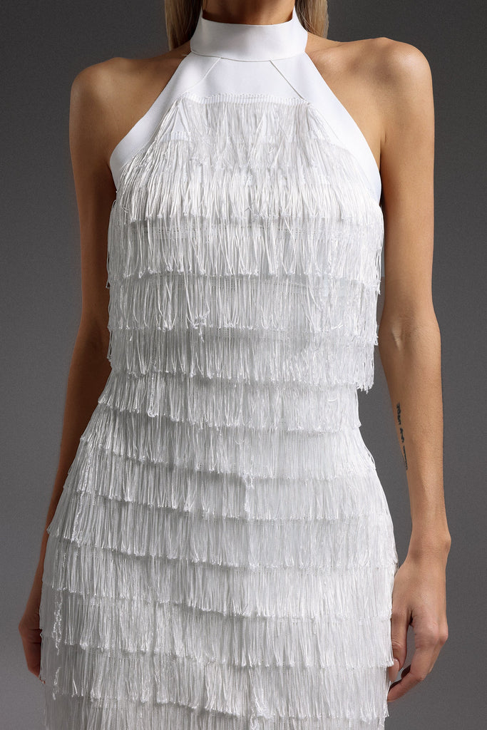 This white vanessa Halter Sleeveless Tassel Bandage Mini Dress is a must-have for any fashion-forward wardrobe. Made with high-quality materials, it features a halter neckline and sleeveless design that effortlessly accentuates your curves. The tassel detailing adds a playful touch while the bandage fabric provides a flattering fit. Perfect for both casual and formal occasions.