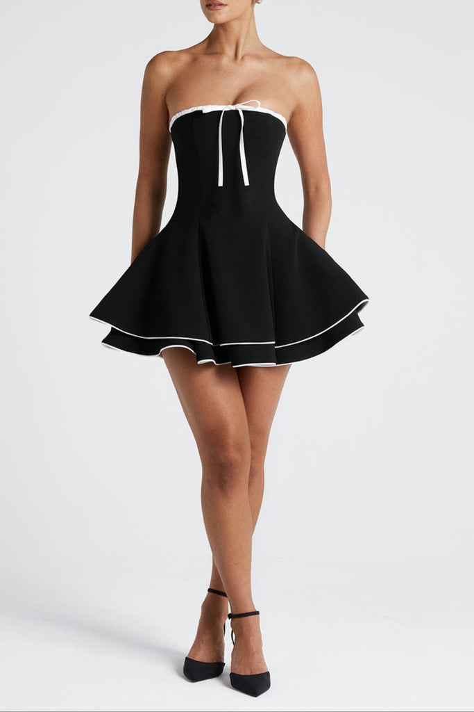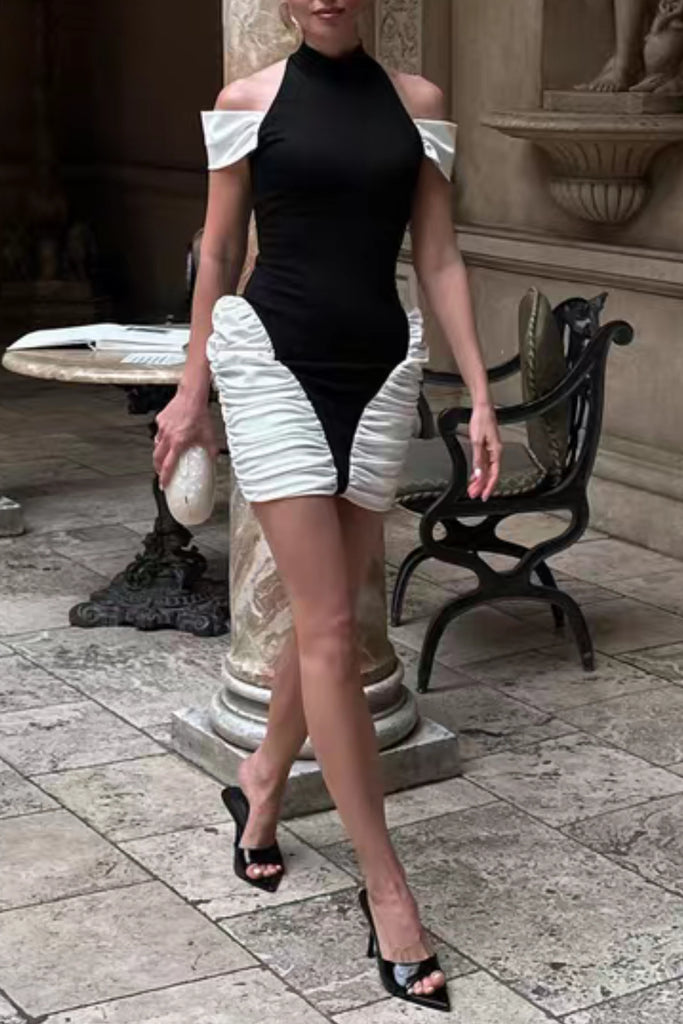 black-white Panel Sleeveless Gathered Halter mini Dress