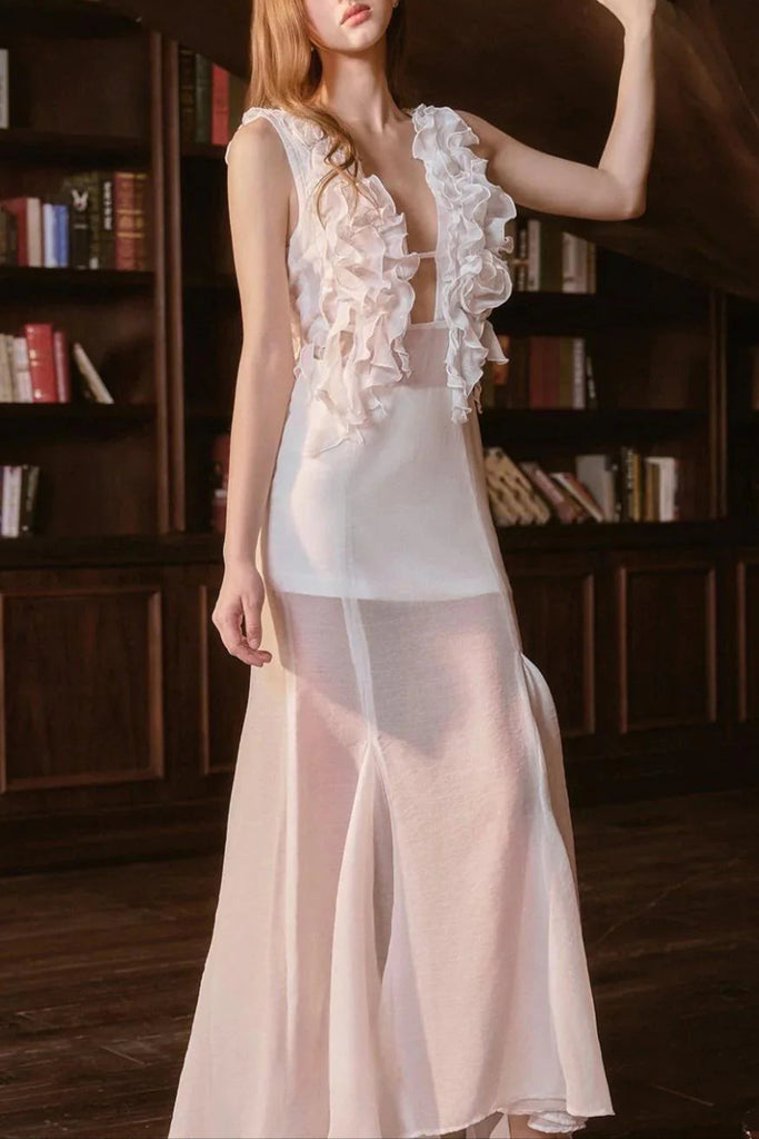 hazel white Deep V-neck halterneck layer ruffle trim maxi dress