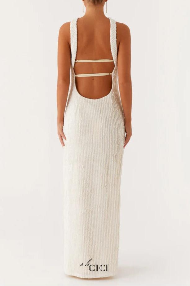 This halter strapless maxi dress in ivory combines elegance with modern design. Featuring a flattering slit, it offers both comfort and a graceful silhouette, perfect for formal occasions or evening events. The strapless halter neckline enhances the neckline while providing a secure fit, making it a sophisticated choice for those seeking timeless style with a contemporary edge.