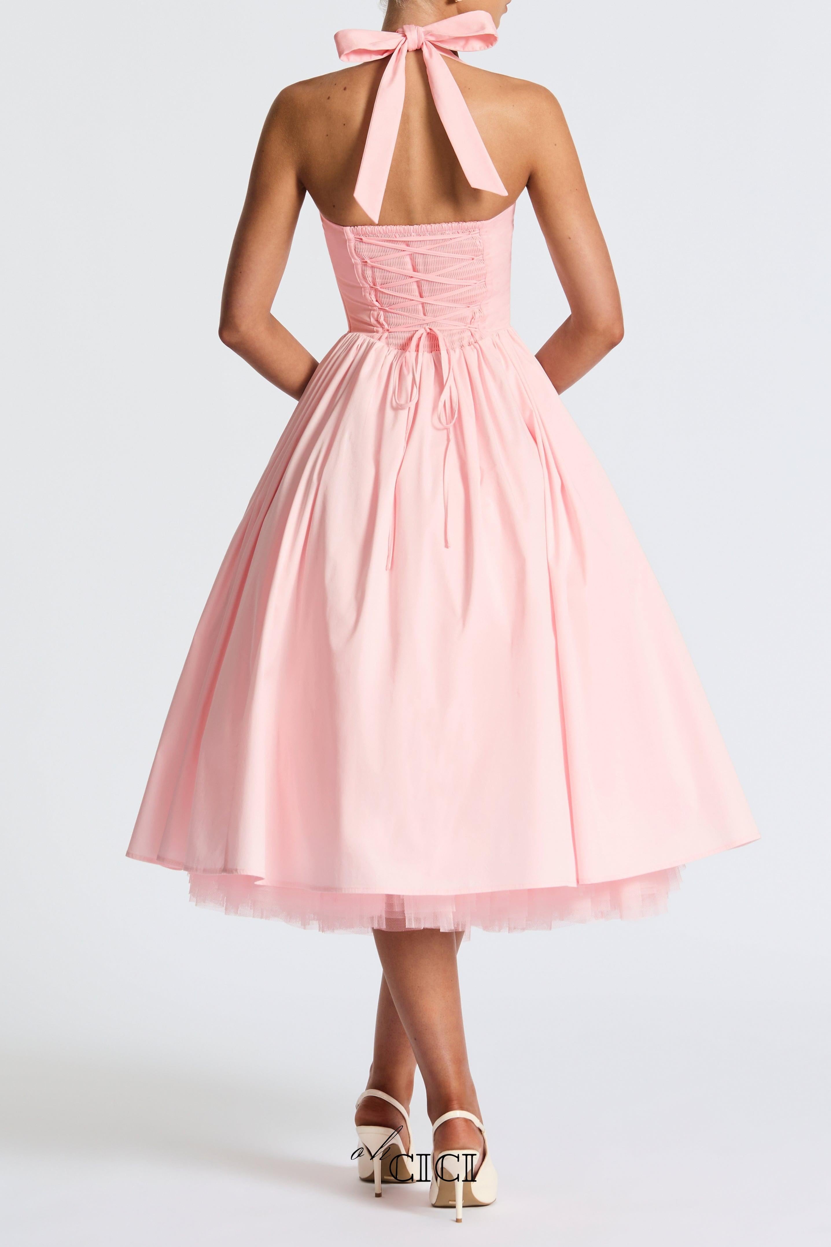 Slip into the Cressida Midi Dress and be the talk of the town! Made with non-stretch cotton nylon elastane voile, this fully lined dress features a square halter neckline and a full skirt gathered at the waist. With princess seams and an internal tulle for added volume, you'll feel like royalty. The lace up back and shirred panel add a touch of playfulness to this elegant blush dress.