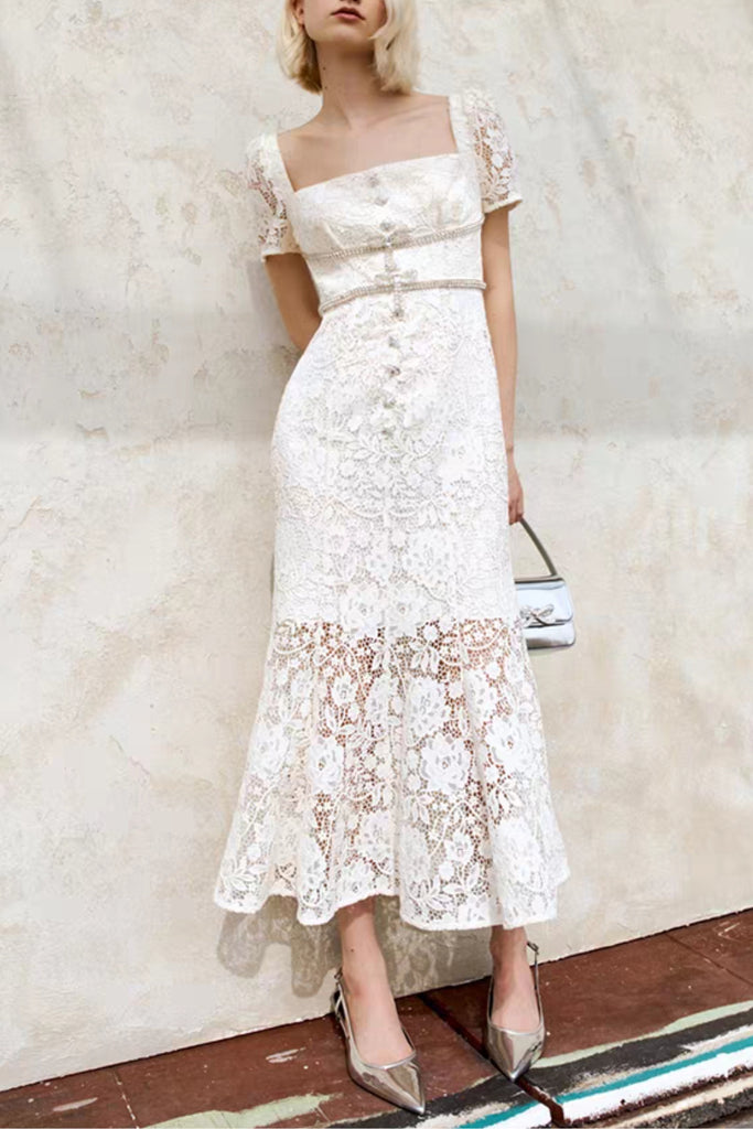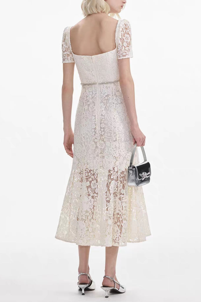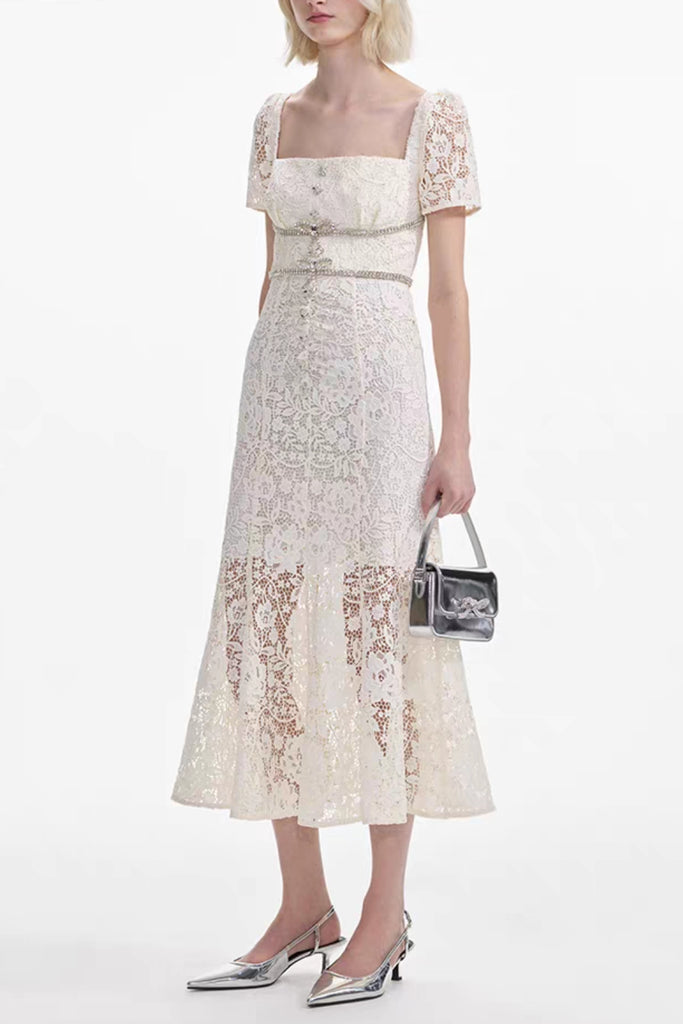 EMBROIDERED LACE MIDI DRESS IN CREAM