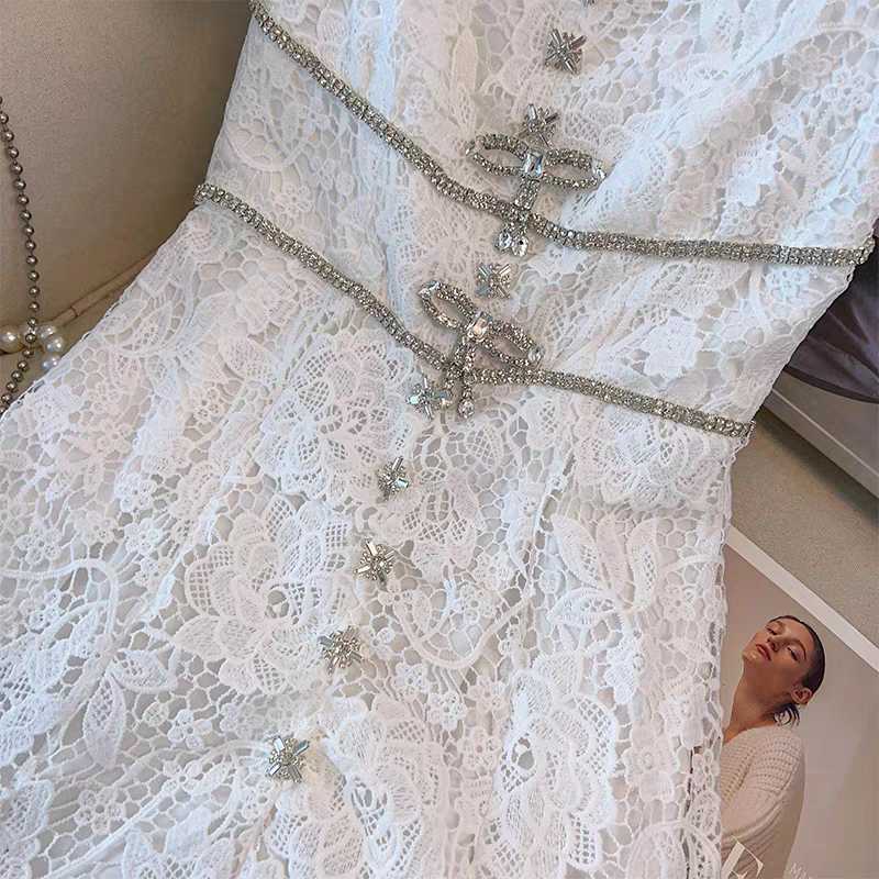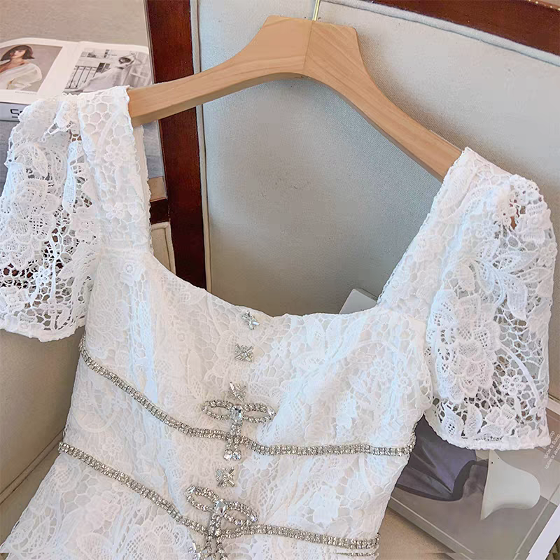 This midi dress is crafted from a woven blend and features a slim fit, square neckline, puffed short sleeves, and a concealed zip fastening at the back. The dress is adorned with buttons and bow design plaques at the front, rhinestone embellishment at the front and back, all-over flower embroidery, and all-over cut-outs. It is partially lined and has a flared hem.