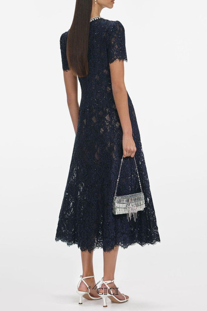A high-shine spin on a timeless classic, this navy lace dress' diamanté and pearl embellished neckline makes it a true showstopper. Add our statement jewellery and heels for a glamorous night out.