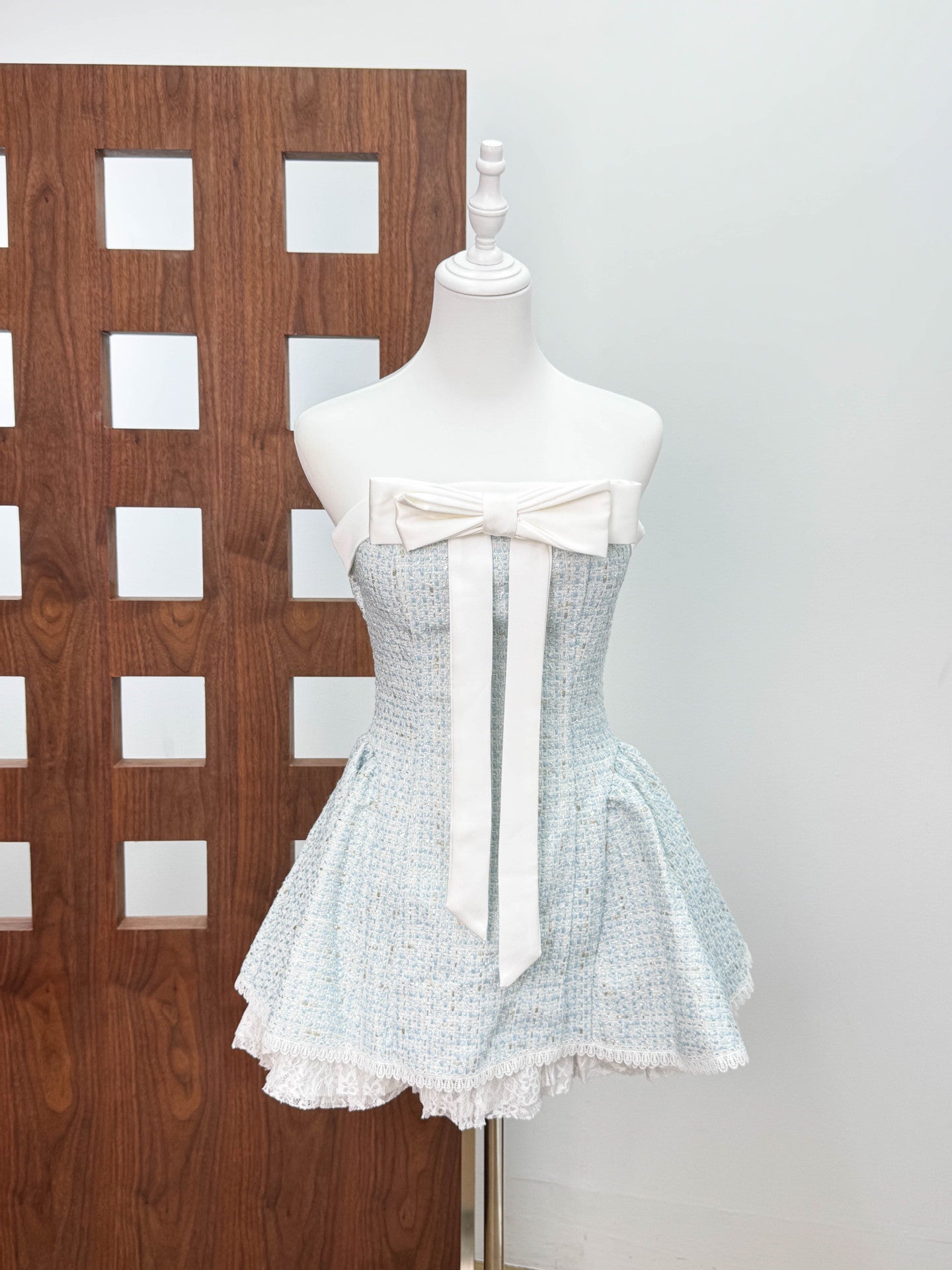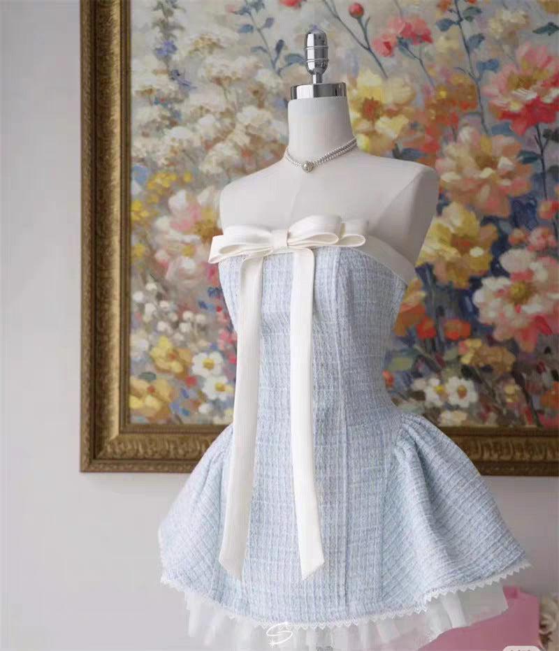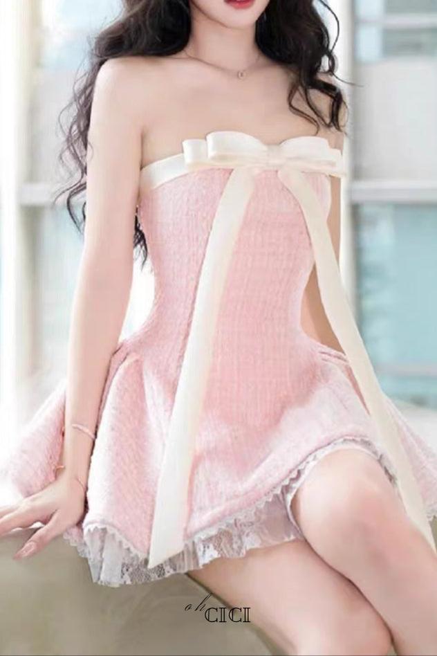 This pink mini dress features a delicate woven lace fabric that offers a refined texture and subtle elegance. Designed as a tube top silhouette, it provides a strapless, body-hugging fit that enhances your natural shape. A charming bow detail adds a sophisticated touch, making this dress ideal for stylish evening events or special occasions where a polished yet playful look is desired.