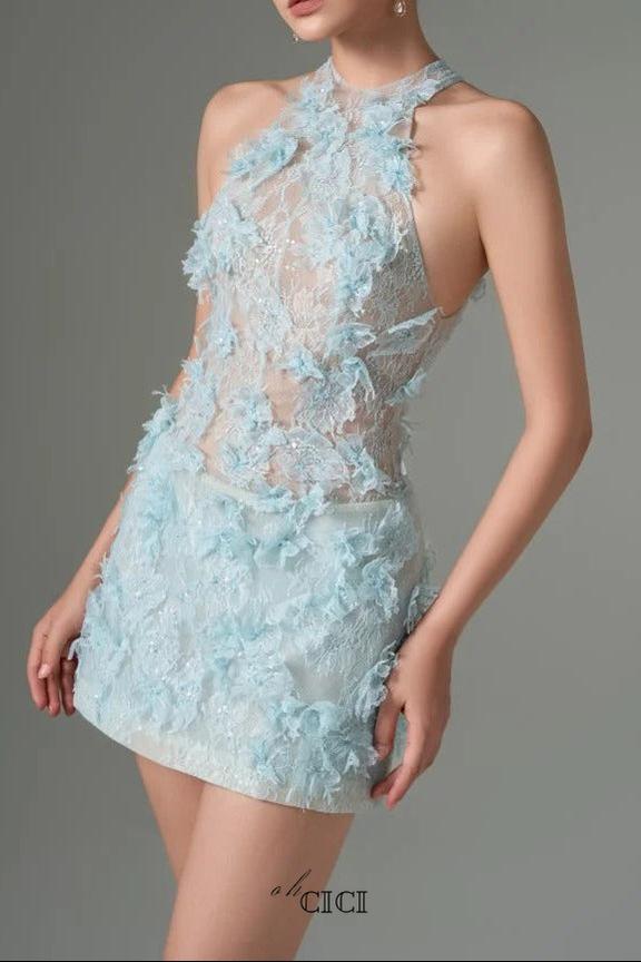 Elevate your wardrobe with the Floral Lace Mini Dress in blue, crafted from delicate lace that showcases intricate floral patterns. Its tailored fit accentuates your silhouette while offering comfortable wear. Ideal for both elegant daytime events and sophisticated evening occasions, this dress combines timeless design with refined craftsmanship for a polished, expert look.