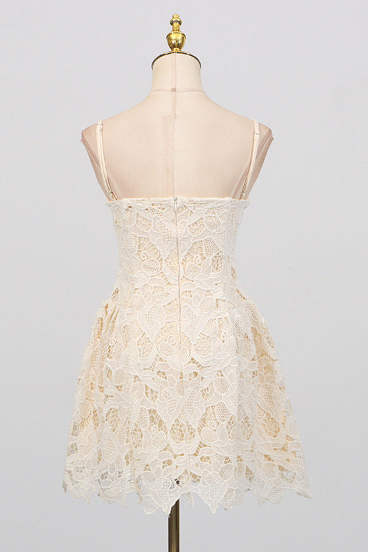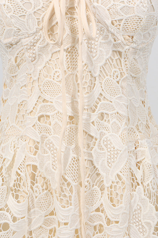 This yellow lace sleeveless mini dress features intricate hollow lace detailing that enhances breathability and visual appeal. Its fitted silhouette offers a flattering shape, making it an ideal choice for warm-weather occasions where style and comfort are key. The vibrant color adds a bold, fresh touch to any wardrobe, perfect for daytime or evening wear.