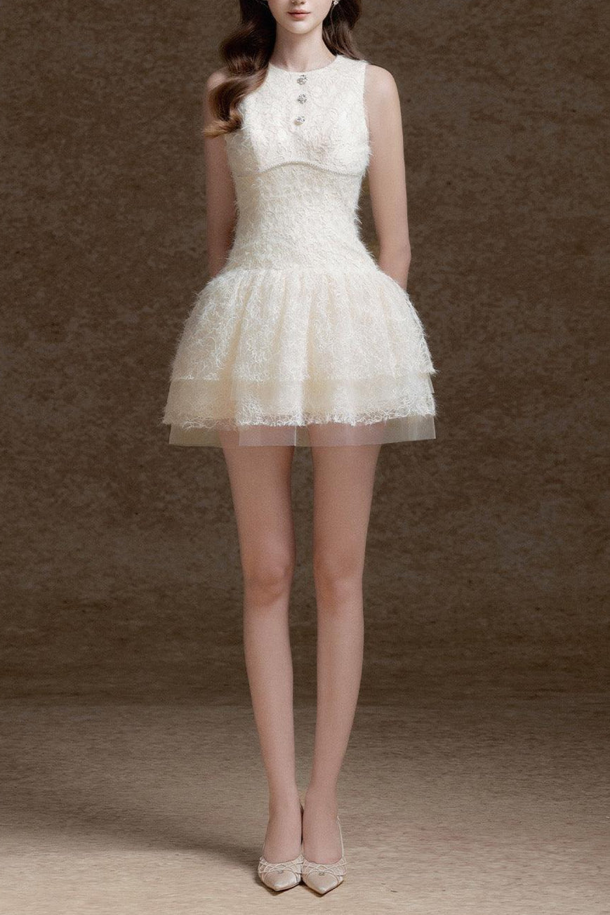 LAYERED JEWEL NECK LACE MINI DRESS IN BEIGE
