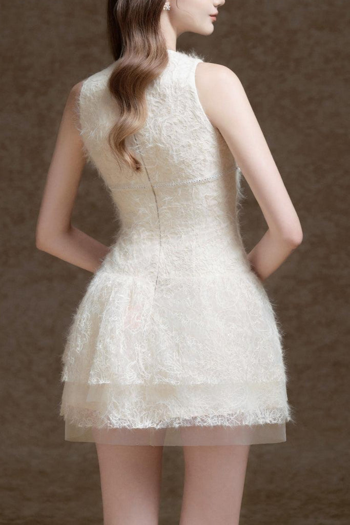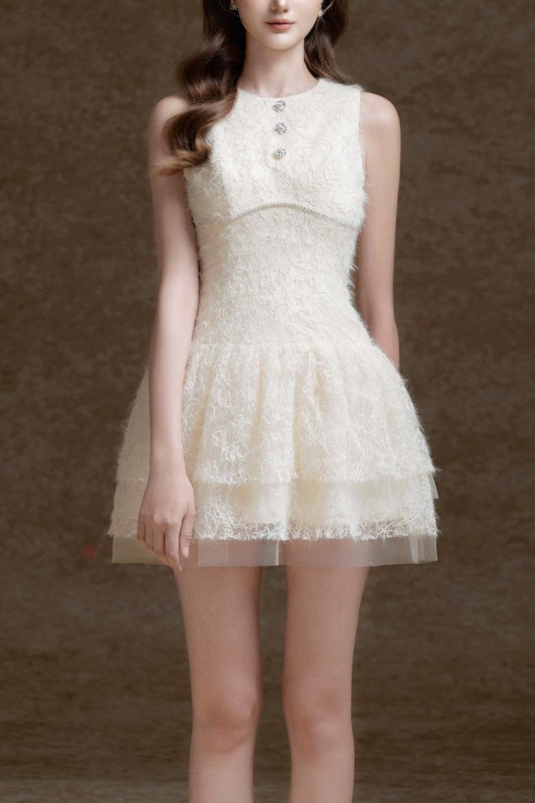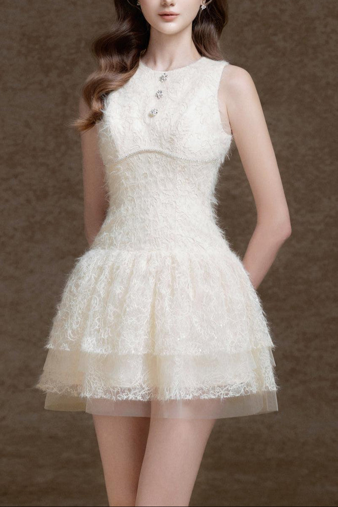 This beige layered jewel neck lace mini dress combines delicate lace detailing with a flattering vest-style silhouette. Its elegant design enhances your natural shape while offering comfort and style for any occasion. Perfect for those seeking a graceful yet modern look.