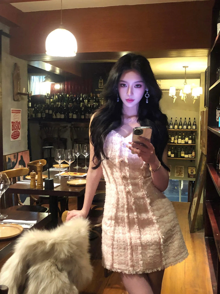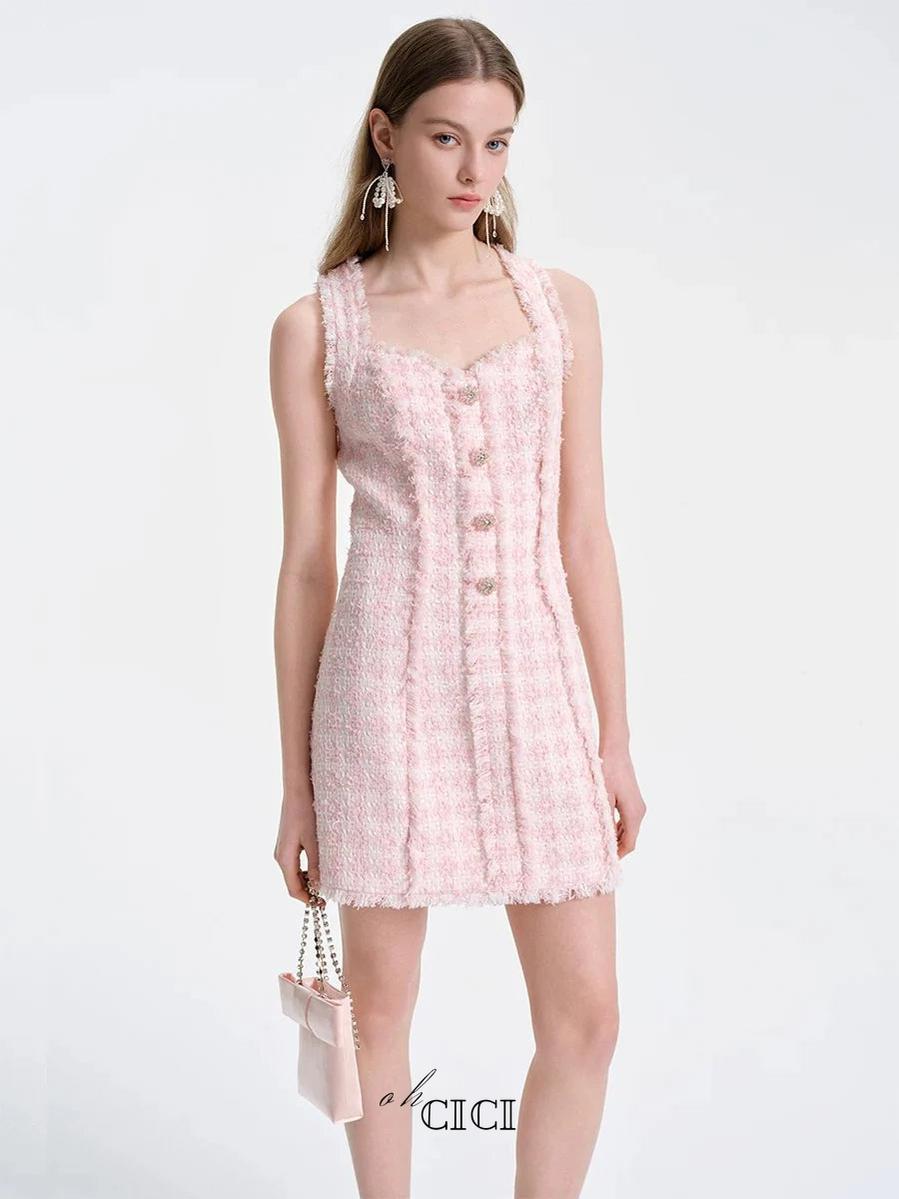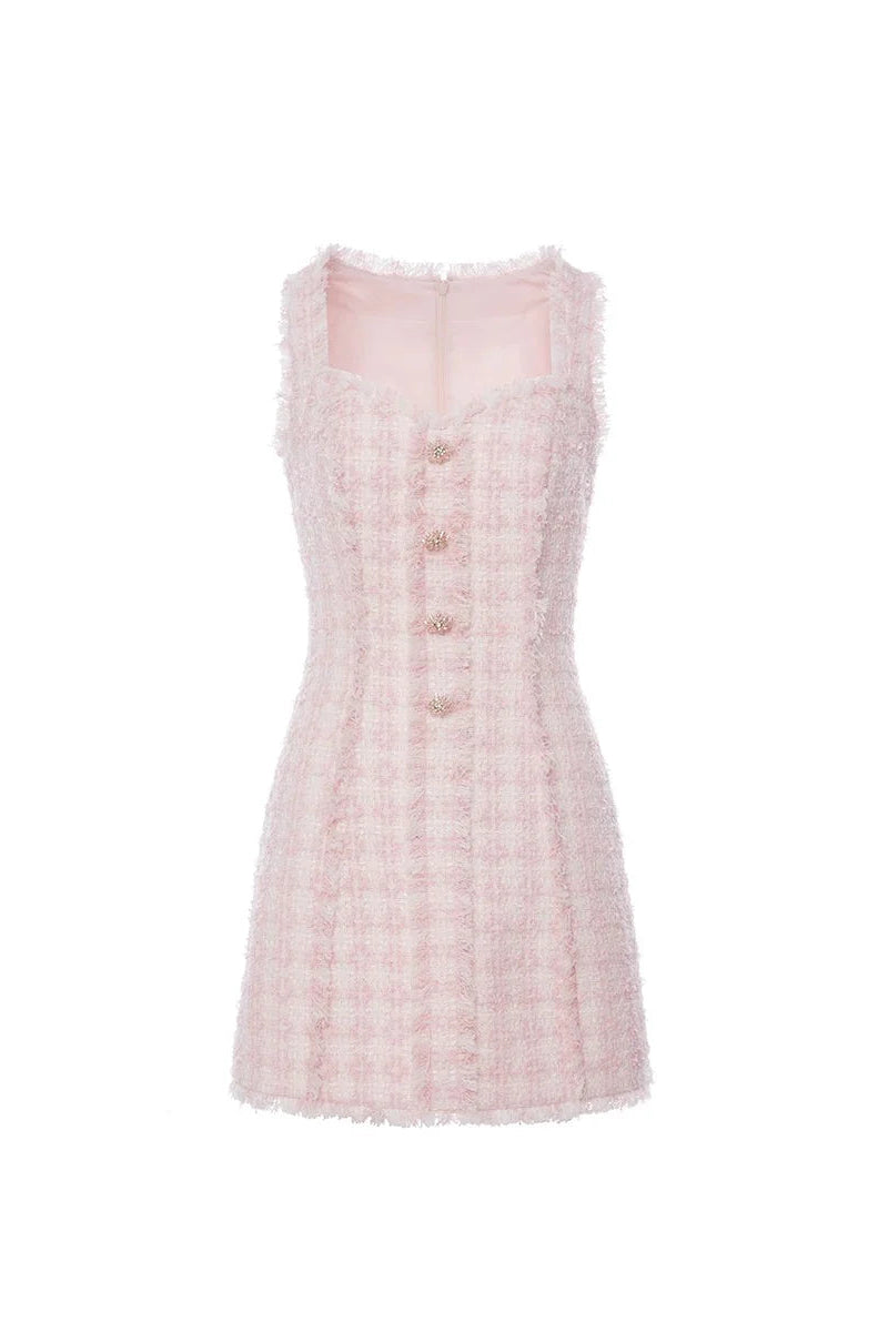Elevate your wardrobe with this sophisticated pink mini dress, designed for those who appreciate refined tailoring. The striking square neckline frames the shoulders beautifully, while delicate tweed trim detailing adds texture and visual interest throughout. Cut to a flattering mini length, this piece transitions seamlessly from daytime elegance to evening occasions. The structured silhouette and quality construction ensure a polished appearance that commands attention. Perfect for fashion-forward individuals seeking a statement piece that balances contemporary style with timeless appeal.