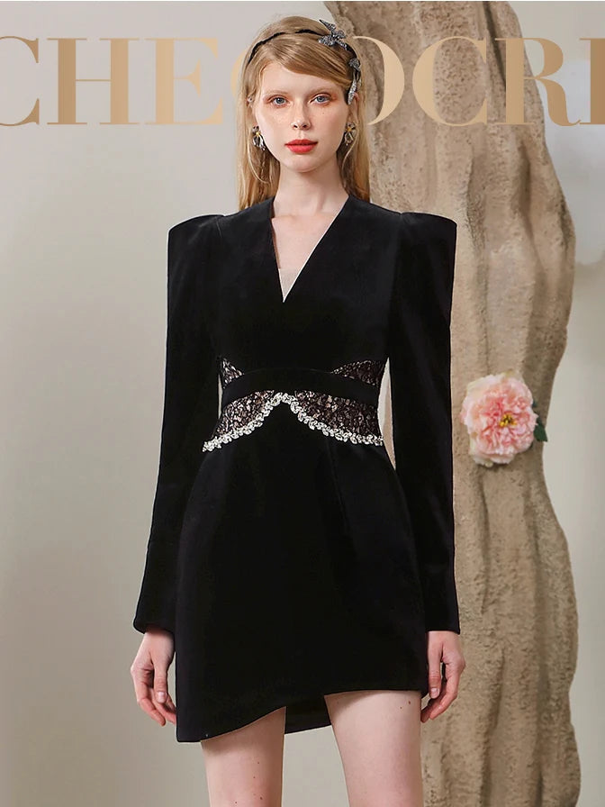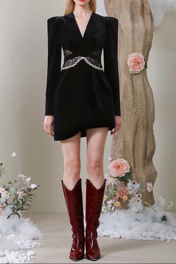 Quintina Black Lace V-Neck Asymmetry Mini Blazer Dress Elevate your evening wardrobe with this sophisticated mini blazer dress, expertly crafted from delicate black lace. The plunging V-neckline creates an alluring focal point, while the asymmetrical hemline adds contemporary edge and movement. Structured blazer tailoring provides polished definition, making this piece equally suited for cocktail events or upscale casual occasions. The lace fabrication offers refined texture and subtle transparency for visual interest. A versatile investment piece that transitions seamlessly from day to night with minimal styling adjustments.