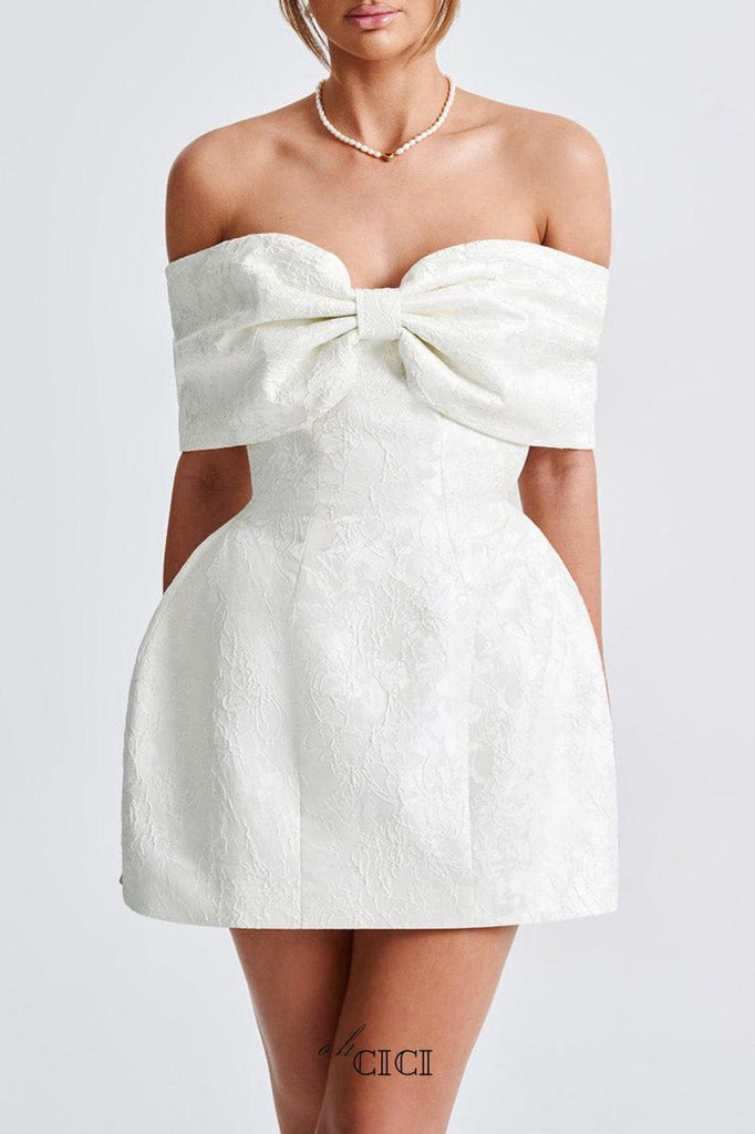 A stylish but oh-so-romantic design, Raquel is a showstopper for your big day. Cut from beautiful floral jacquard fabric, it features an off-the-shoulder bardot bow neckline to flatter the décolletage. The mini dress is complete with a tulip shaped skirt and lace up back for your perfect fit. Style with flower-adorned heels and pretty waved hair.Â