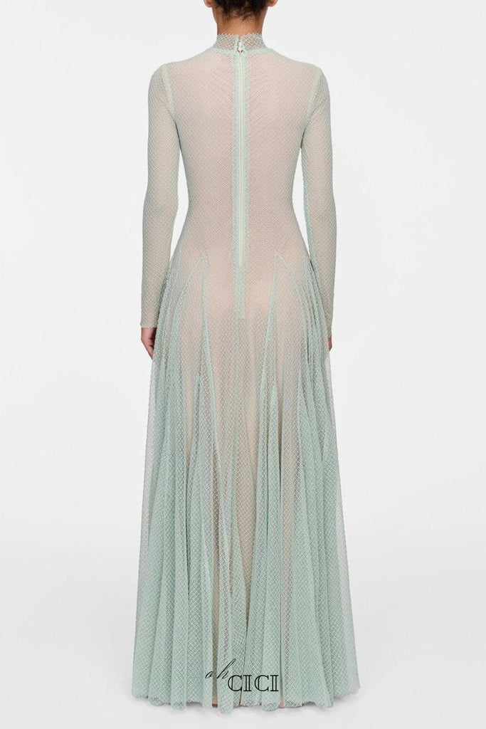 Elevate your wardrobe with the Anila Mint Mesh Long Sleeve Slim Maxi Dress. Crafted with delicate mint mesh, this dress contours the body for a flattering slim silhouette while offering long sleeve coverage for a sophisticated look. Its maxi length adds elegance and versatility, perfect for both formal events and stylish evenings. The breathable mesh fabric ensures comfort without compromising style, making it a refined choice for those seeking modern grace and effortless charm.