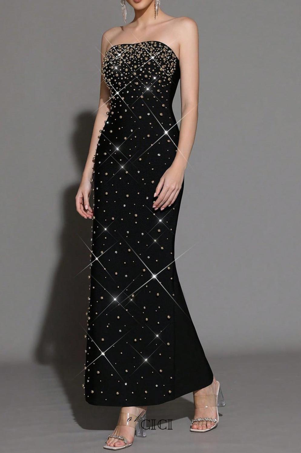 This strapless black maxi dress features exquisite pearl and rhinestone beading along the straps and bodice, adding refined elegance and subtle sparkle. Crafted to flatter the silhouette, it offers a seamless fit that enhances posture and confidence. Ideal for formal events, this dress combines classic black with luxurious embellishments for a sophisticated, timeless look.