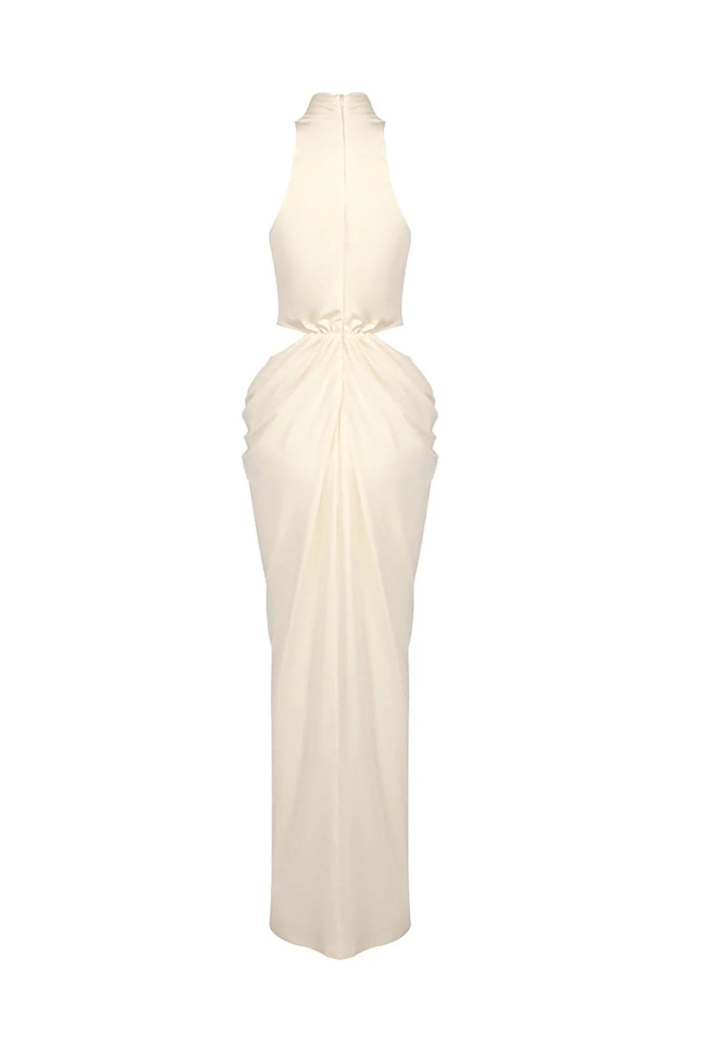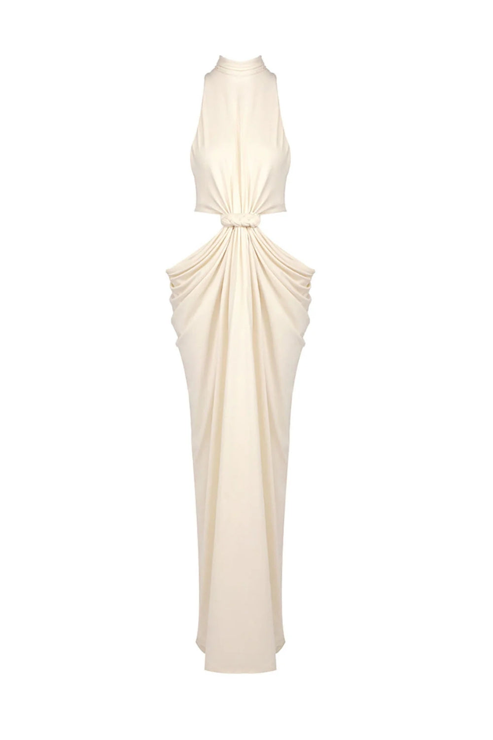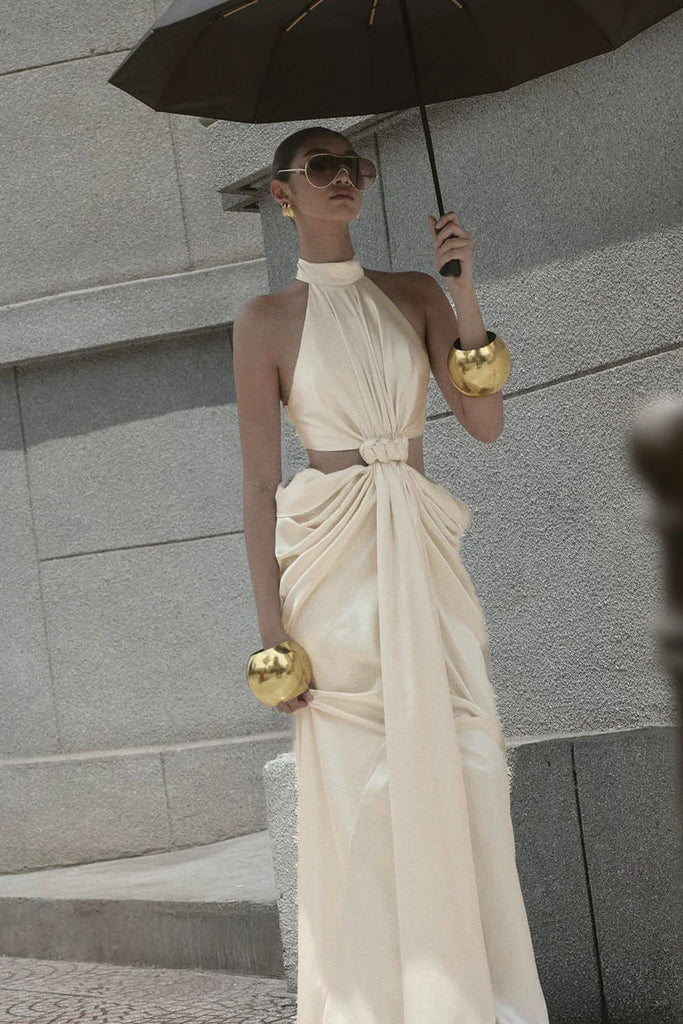 Elevate your evening wardrobe with the Stephanie Cutout Waist Halter Maxi Dress in beige. This sophisticated piece features a flattering halter neckline and a striking cutout detail at the waist that adds modern flair to a timeless silhouette. The flowing maxi length creates an elegant, elongated look perfect for special occasions, date nights, or upscale events. The neutral beige tone pairs effortlessly with your favorite accessories, making it a versatile addition to your collection. Slip into confidence and grace with this show-stopping dress.