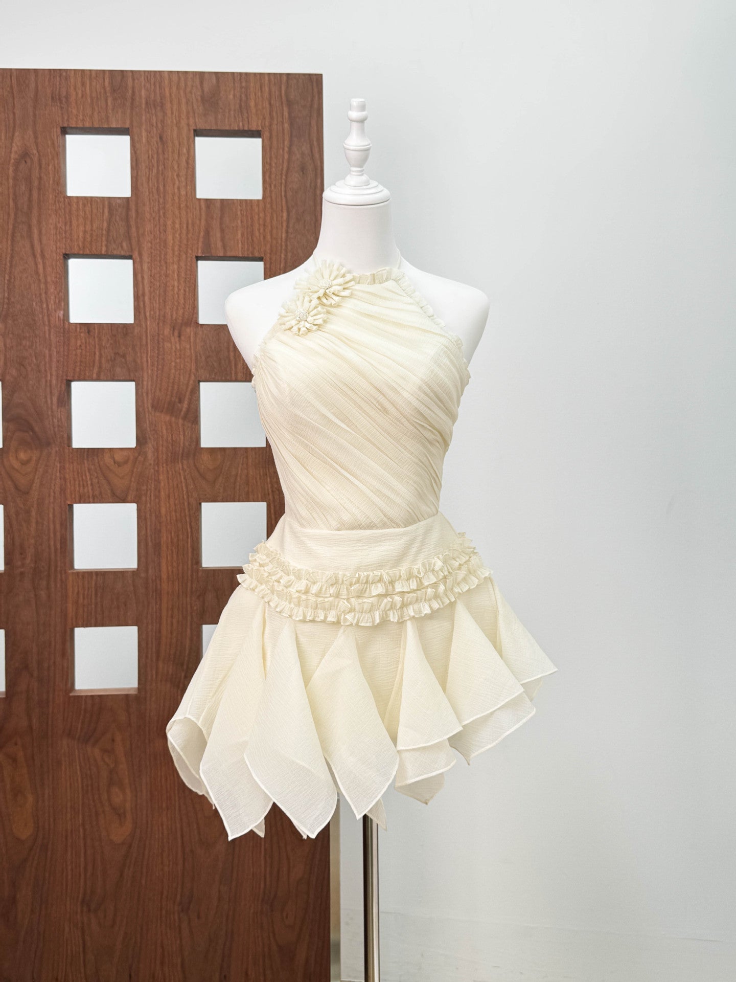 astrid Halter neck 3D flower lace puffy mini dress in white – OH CICI