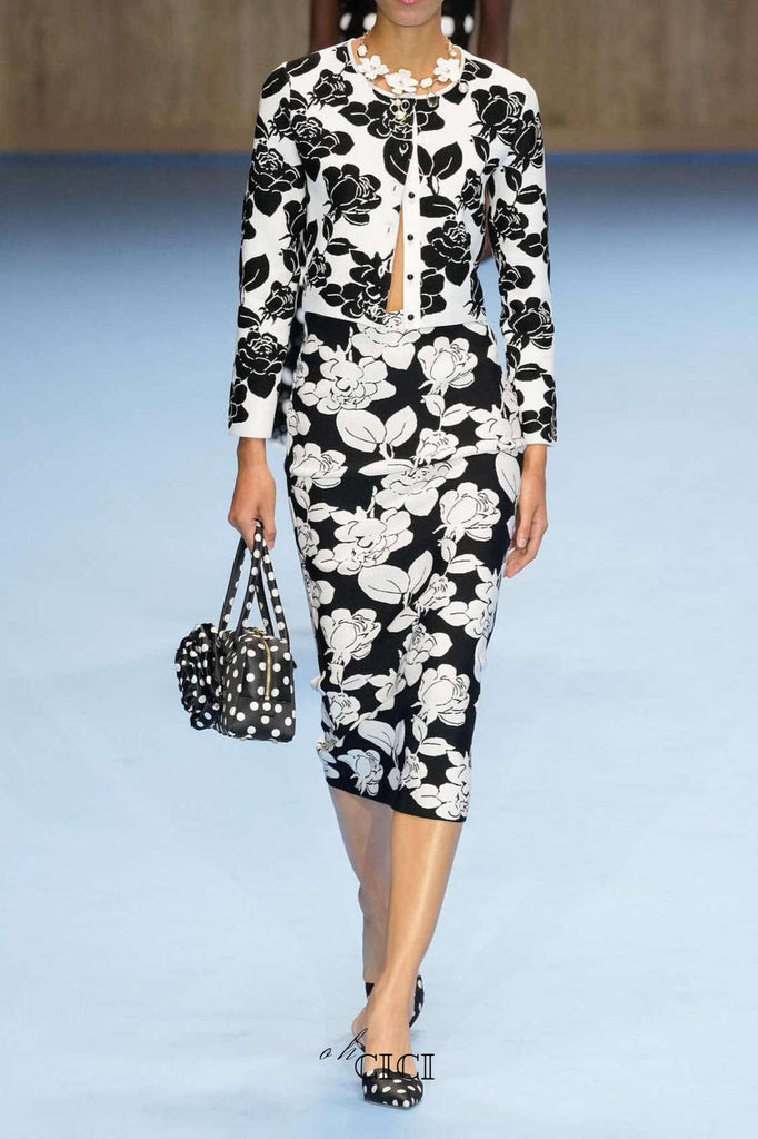 dominic grey Round Neck Long Sleeves Flower Top And Skirt Two-Piece Set