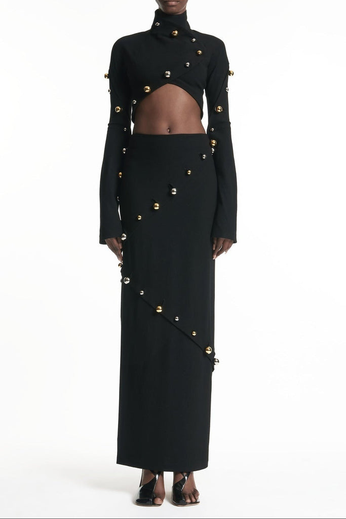 Button-embellished cotton-jersey top maxi skirt suit in black