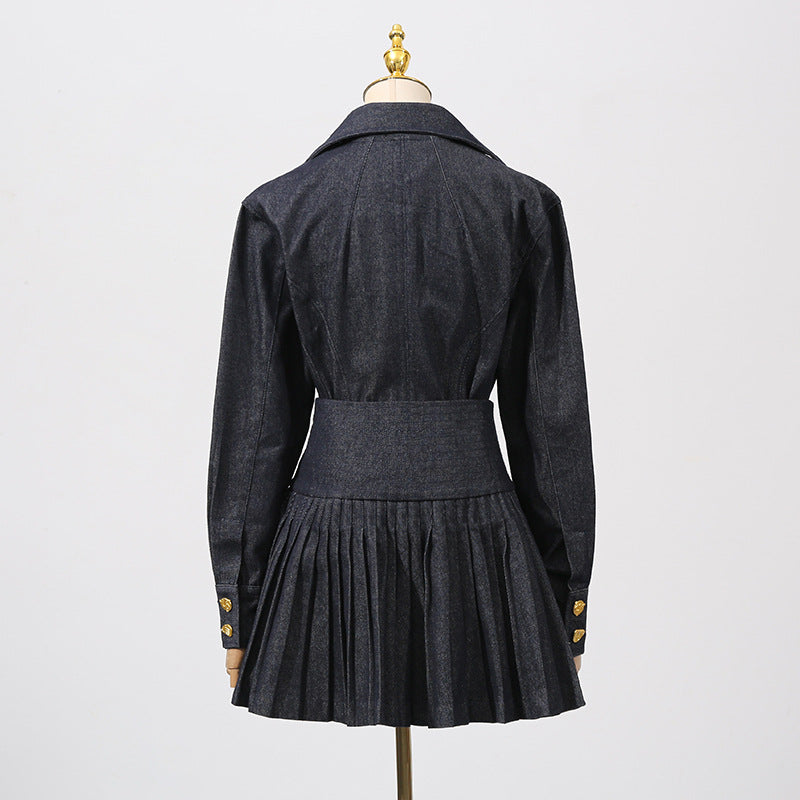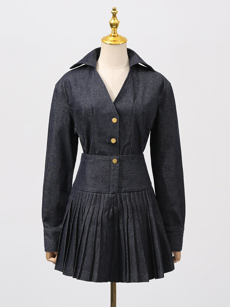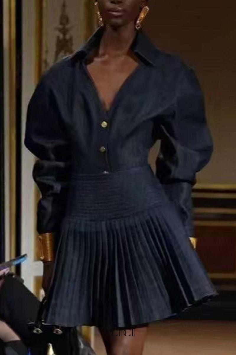 Elevate your wardrobe with this sophisticated two-piece ensemble featuring a tailored single-breasted top paired with a gracefully pleated skirt in timeless navy blue. The structured top provides a polished silhouette, while the pleated skirt offers refined movement and dimension. This versatile combination transitions seamlessly from professional settings to elevated casual occasions, delivering understated elegance with every wear.