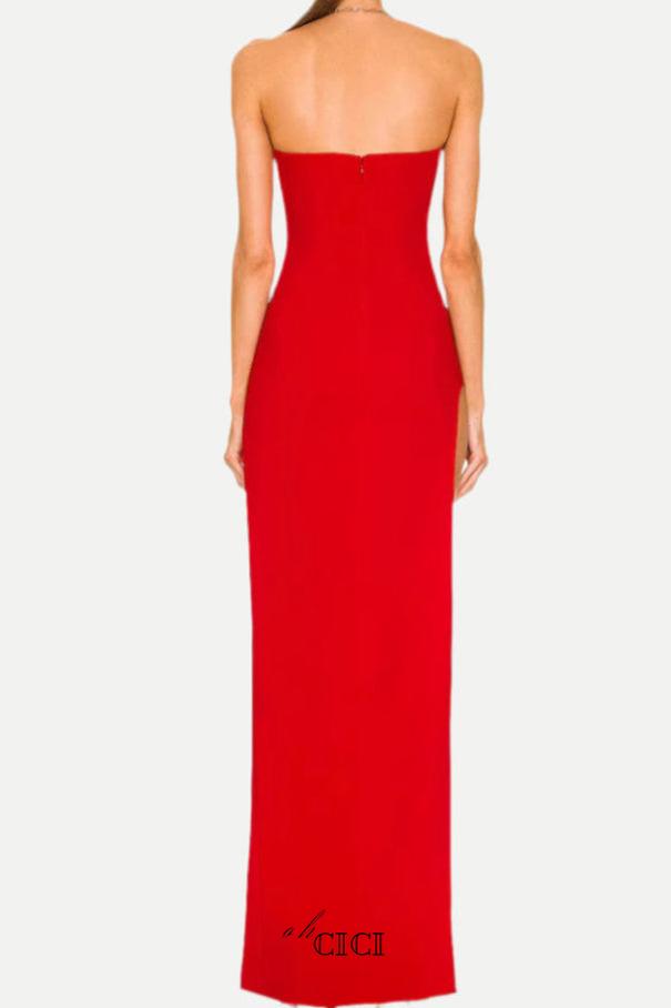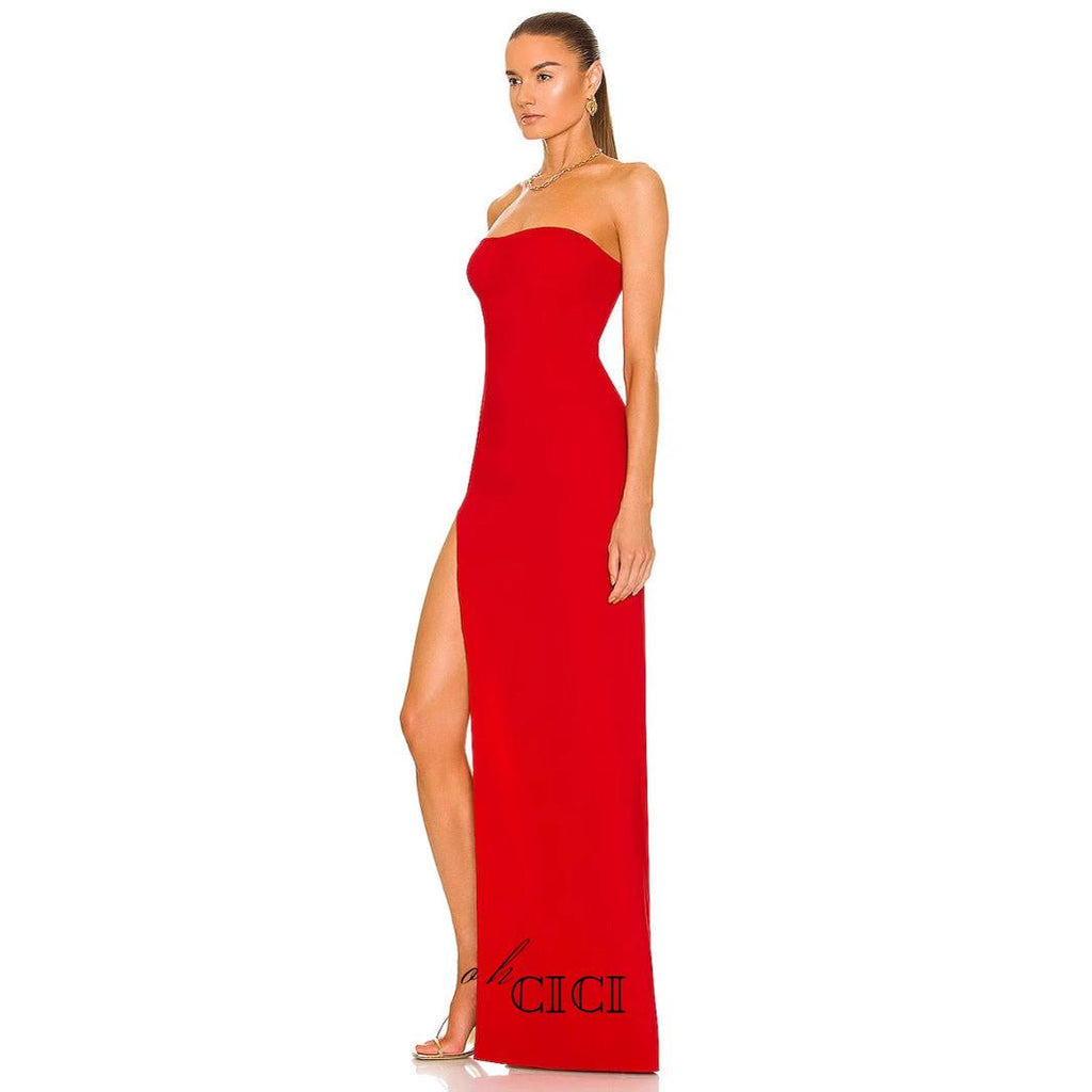 Add a pop of color to your wardrobe with our Tube Slit strapless Gown in red. The strapless design offers a timeless and elegant look, while the slit adds a touch of allure. Perfect for formal events and special occasions, this gown is sure to make a statement.