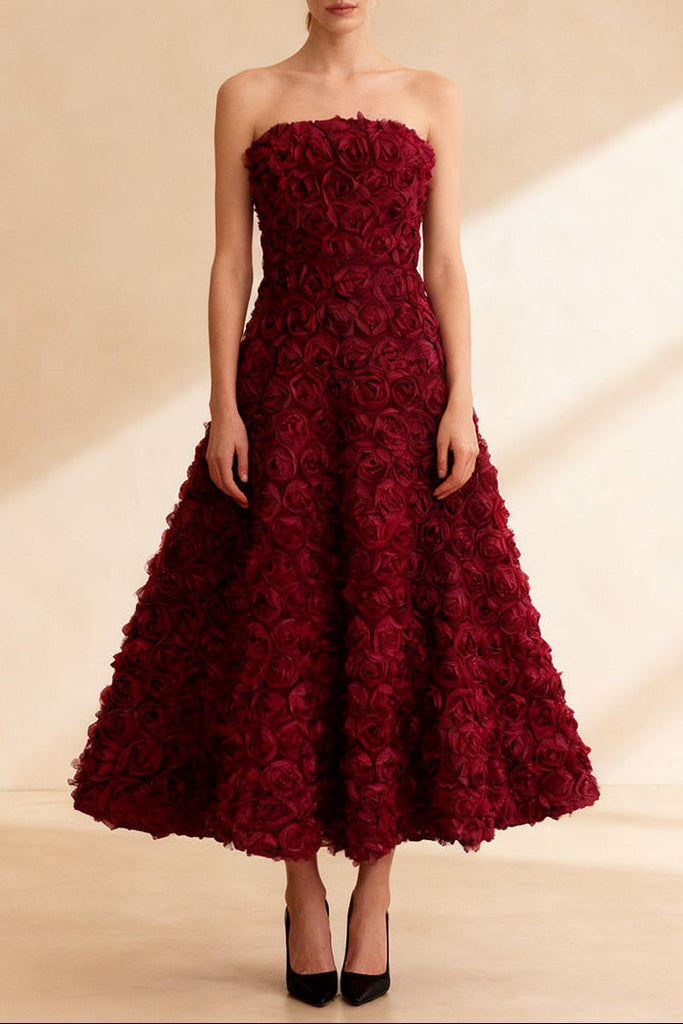 mona 3D Rose Petal Strapless Mesh Maxi Dress in wine red