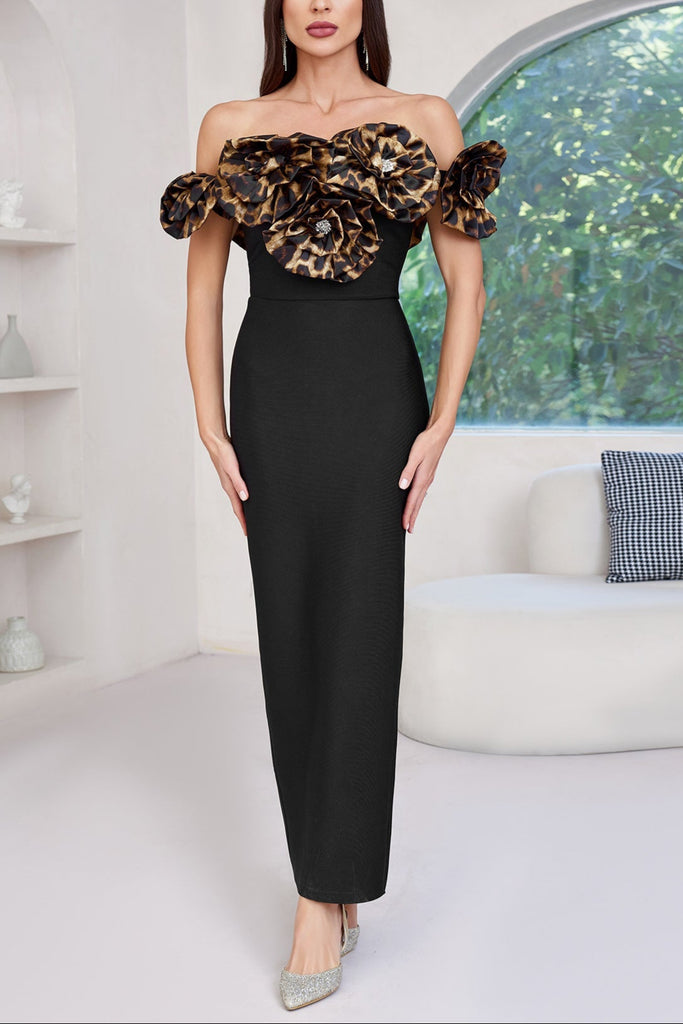 3d flower leopard pattern bandage maxi dress in black