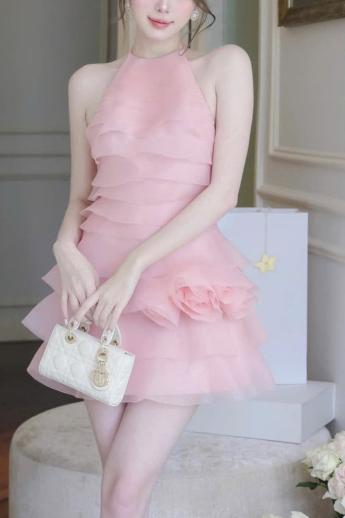 3d flower halter ruffle layer mini dress in pink