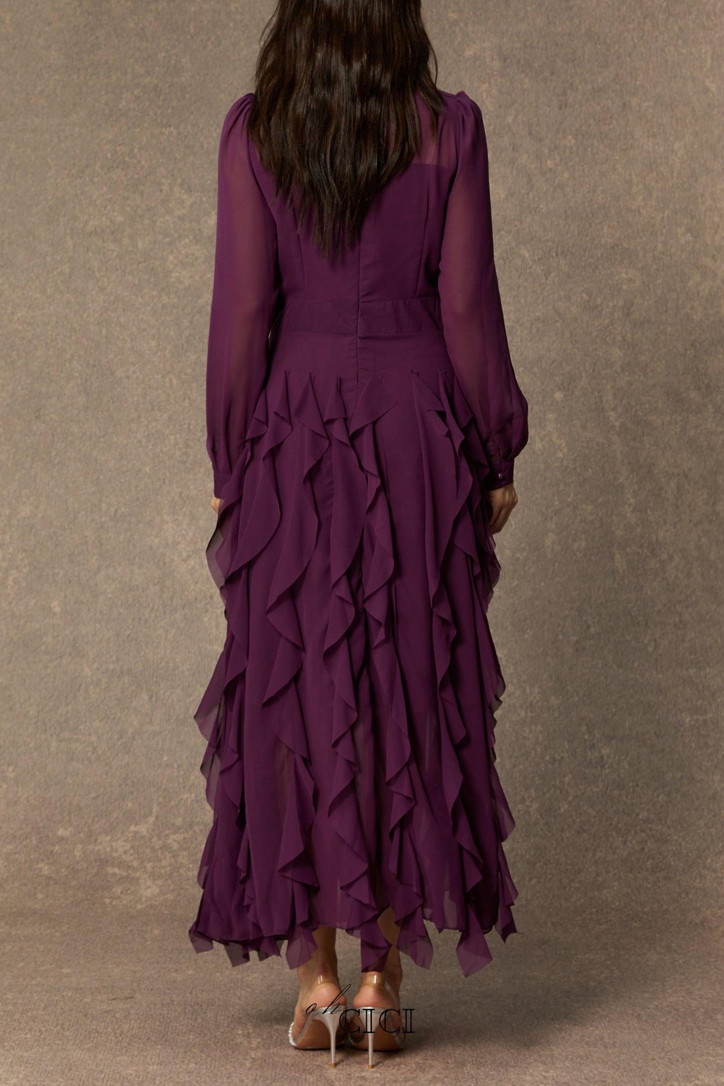 Design: Tie‑Neck Bow, Beaded Fringe, Sheer Long Sleeves, Multi‑Layer Irregular Ruffle, Maxi Length.