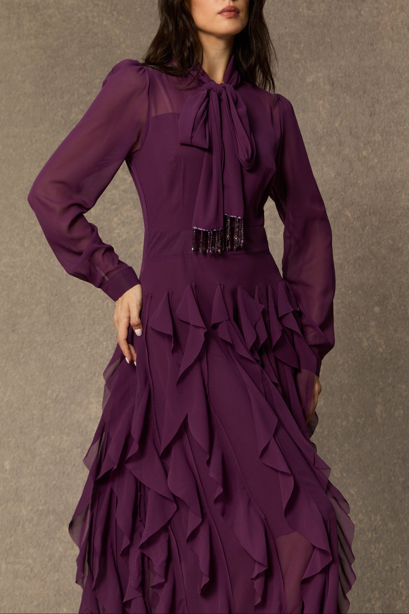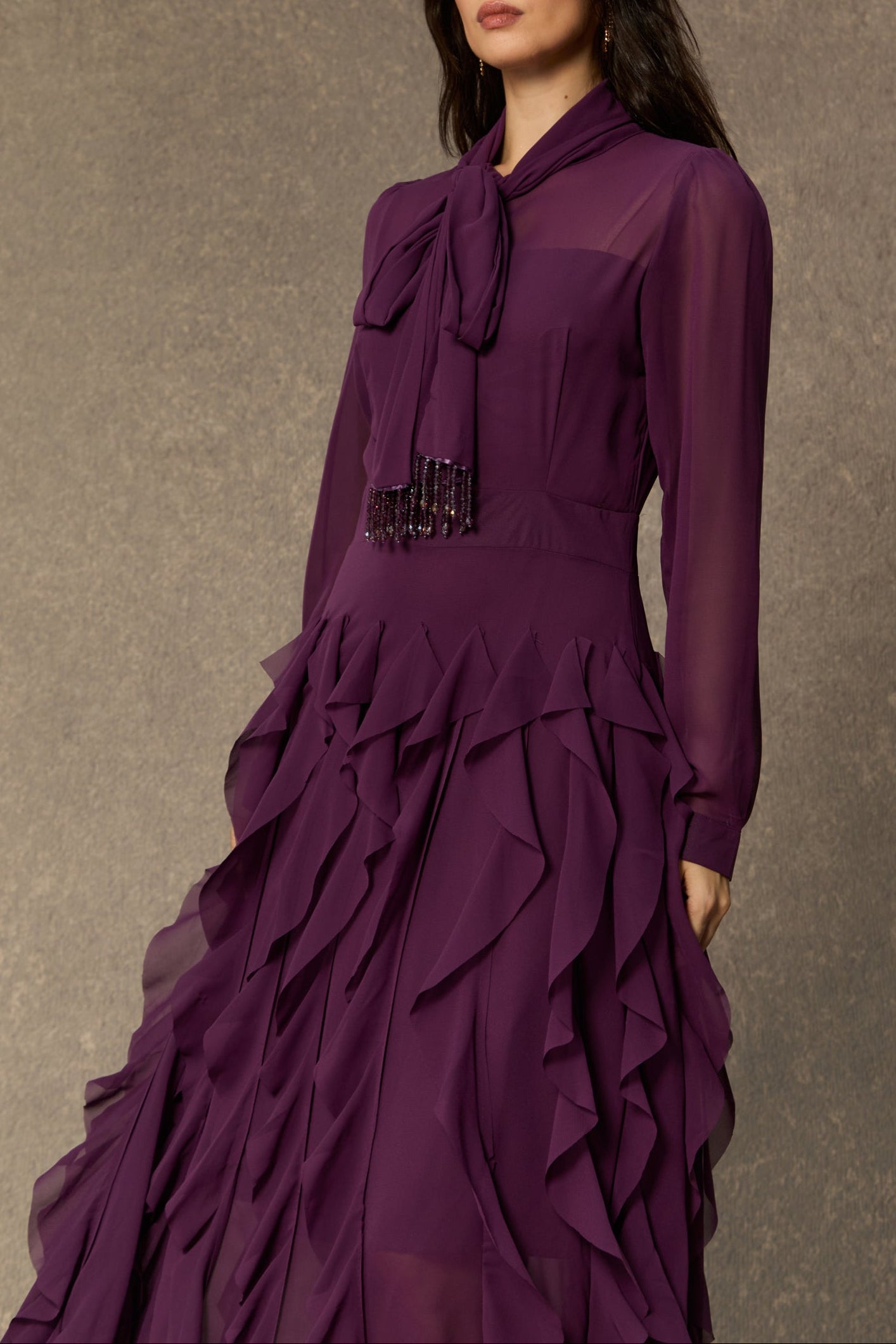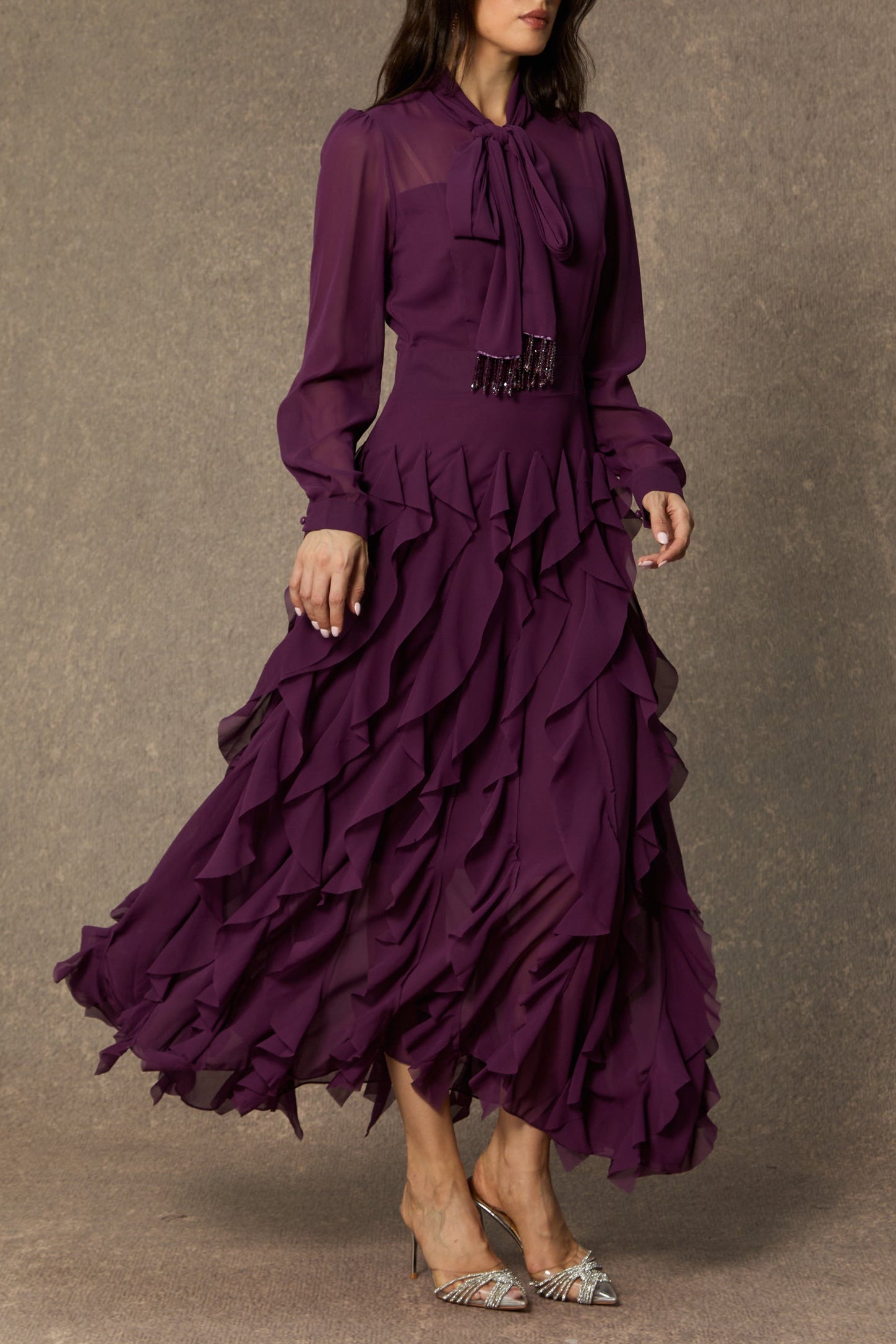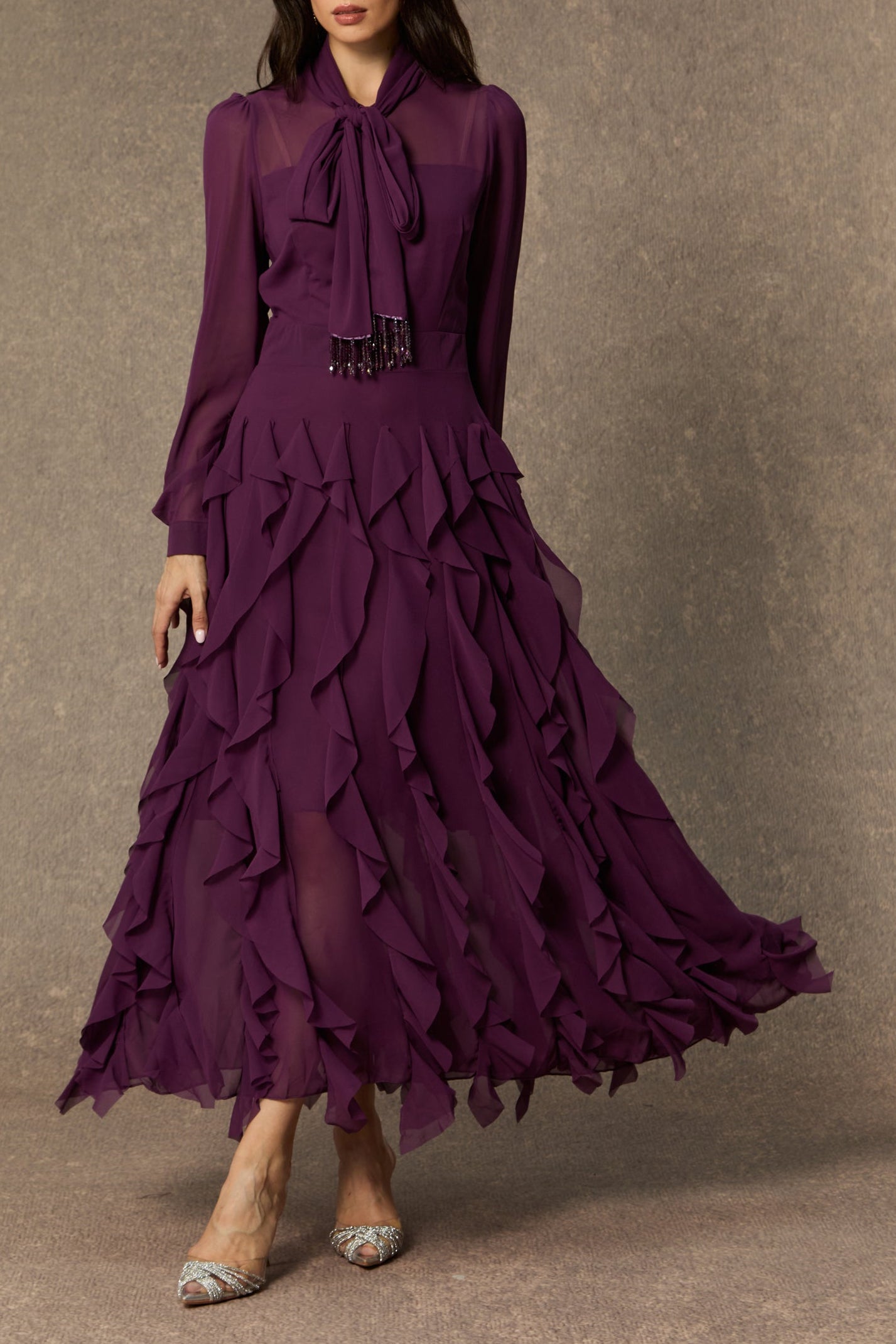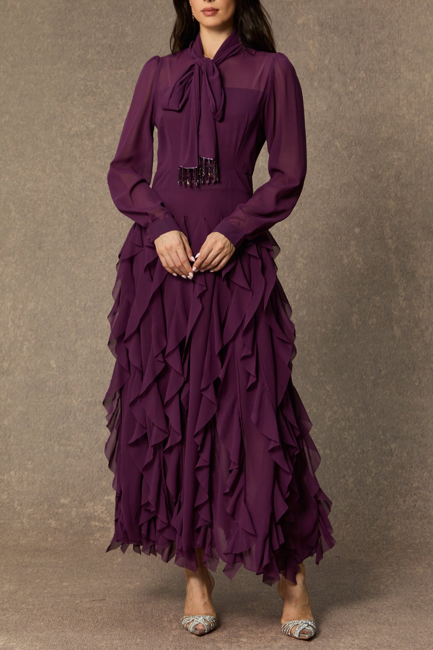 bonnie Purple Bow Neck Tiered Ruffle Maxi Dress